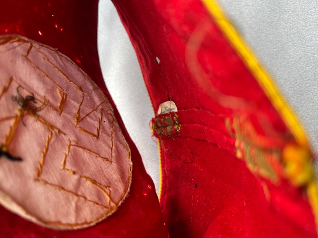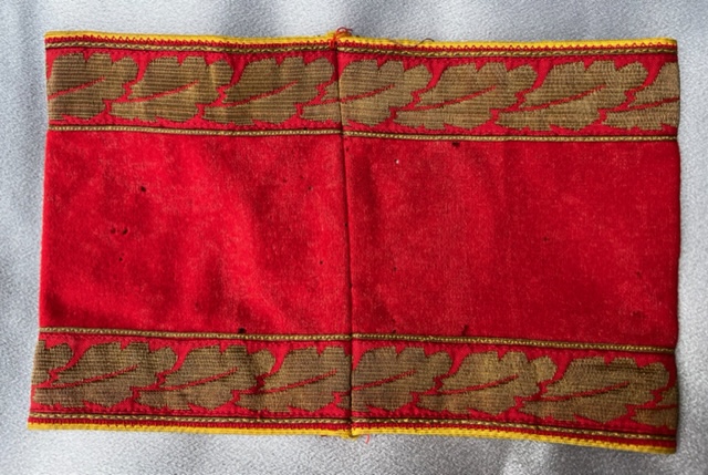 Armband for the Reich Leiter eines Oberen (Obersten-Amtes). Gorgeous bullion oak leaves and borders, black ribbon swastika. partial RZM tag. This one came off a tunic, still sewn together, approx. 17 inches in length, slight mothing as shown. This is one of the rarest armbands to find, only the 3rd one I have owned in 40+ years, 2nd highest rank at the Reich level.