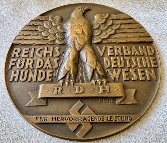 heavy Bronze plaque; obverse bearing a raised German national eagle clutching a banner bearing initials “R.D.H.” (Reichsverband für das Deutsche Hundewesen/German Kennel Club), flanked by an inscription of “REICHSVERBAND FÜR DAS DEUTSCHE HUNDEWESEN”, above a mobile swastika overlaid by a banner bearing an inscription of “FÜR HERVORRAGENDE LEISTUNG” (“FOR OUTSTANDING MERIT”), designer marked “HAGER”, the reverse maker marked "A. Burgau Augsburb" , 14.5 CM, excellent condition.