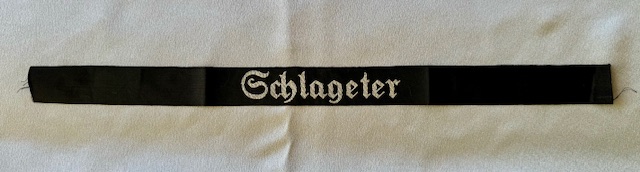 SA Honor Cuff Title "Schlageter". Machine-woven off-white with gothic style lettering on black. 18" in length
