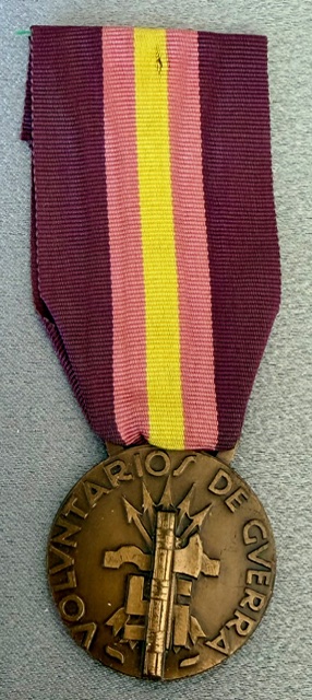 Spanish Civil War Volunteer's Medal. Commemorative medal for the volunteers of the Spanish civil war, inscribed in Spanish “GUERRA POR LA UNIDAD ESPAÑOLA" (War for Spanish Unity) on the obverse and “VOLUNTARIO DE GUERRA" (War Volunteers) on the reverse, 33 mm