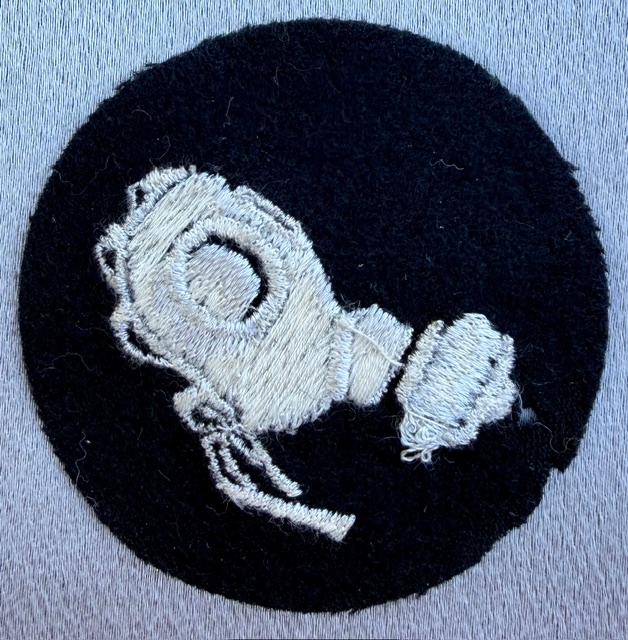 SS Gas Protection Insignia. Black cloth round backing, off white machine embroidered gas mask.