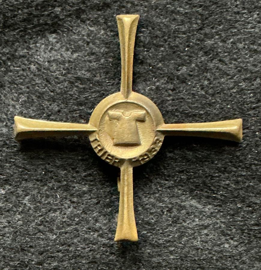 Trier 1934 Tinnie, metal pinback, pin marked "GES. GESCH." twice, 46mm x 46mm