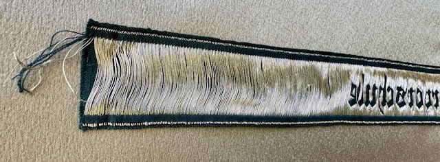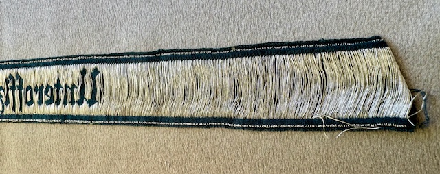 Unteroffiziervorschule Cuff Title in green rayon construction with machine woven, Gothic style script, “Unteroffiziervorschule” in bright, silver/aluminum, flat-wire threads. Mint condition
