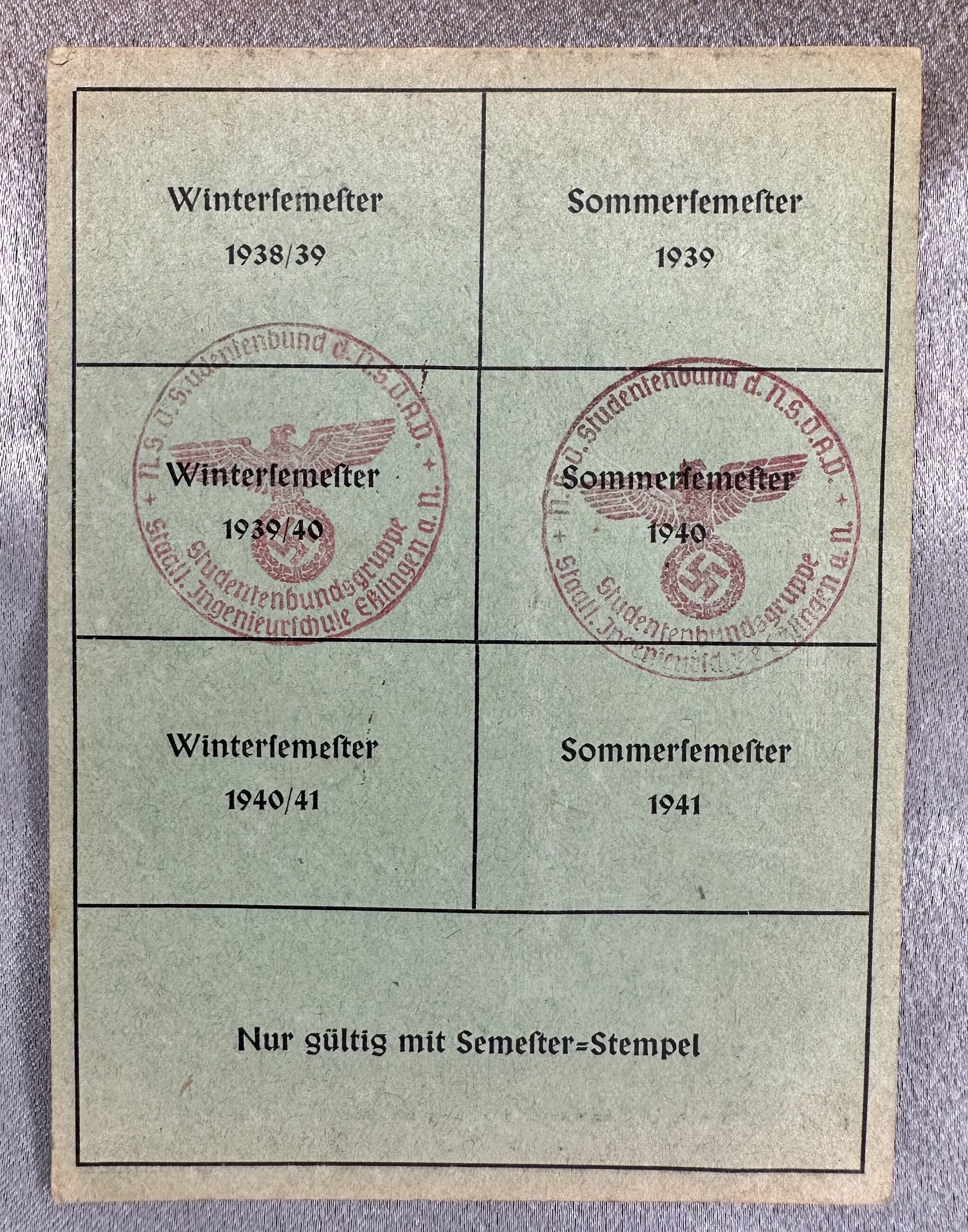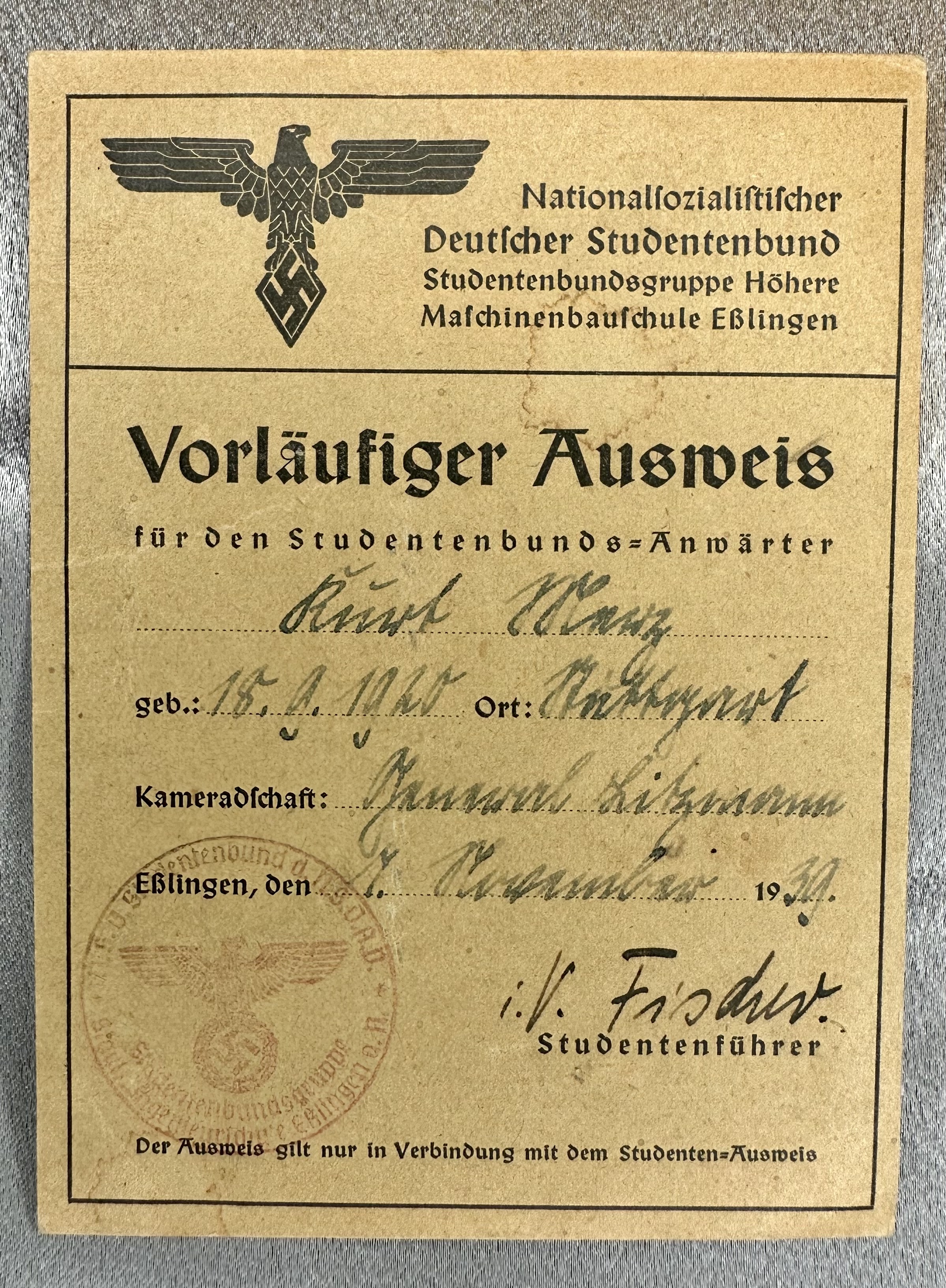 Vorläusiger Ausweis für den Studentenbund Anwärter