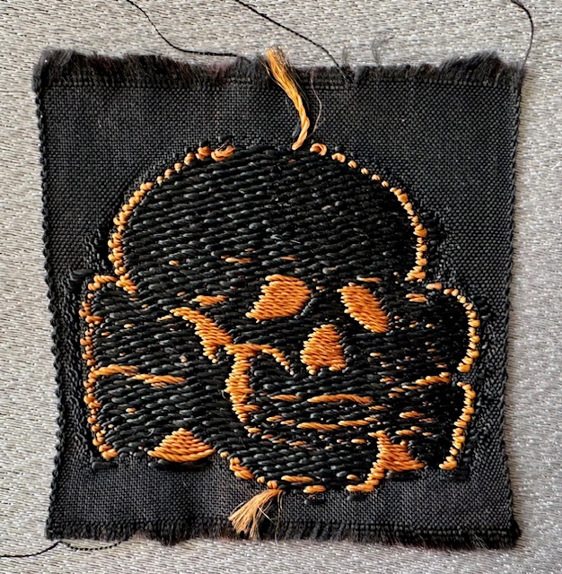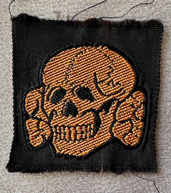 Waffen SS Camouflage Cap Brown ‘BeVo’ Totenkopf (Totenkopf für Tarn-Einheitsfeldmütze). Brown colored flat woven ‘BeVo’-style Waffen-SS cap skull for a camouflage cap, worn on the "autumn side" of the reversible camo cap. The piece remains in mint condition. Extremely rare insignia!