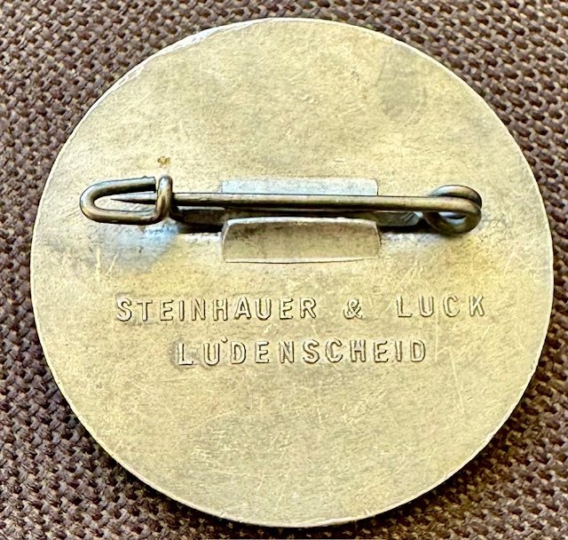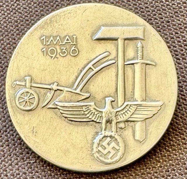 1 Mai 1936 Tinnie, maker marked "Steinhauer & Luck Lüdenscheid, metal pinback, 35mm