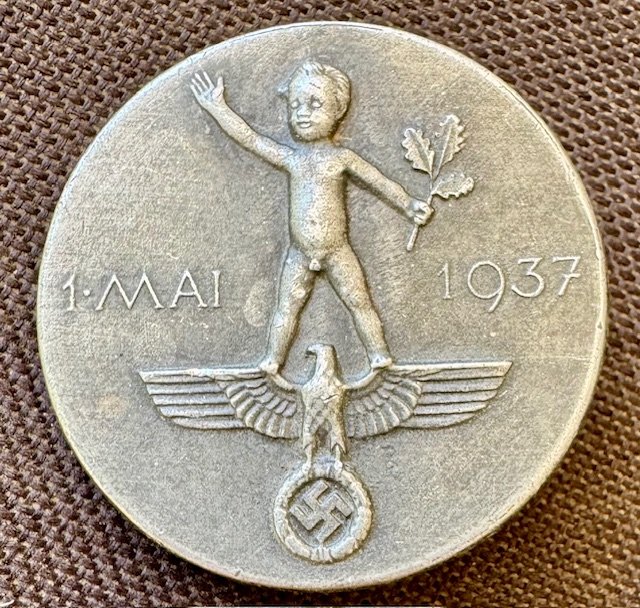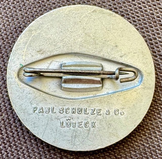 1 Mai 1937 Tinnie, reverse marked "Paul Schulze & Co Lübeck, metal pinback, 36mm