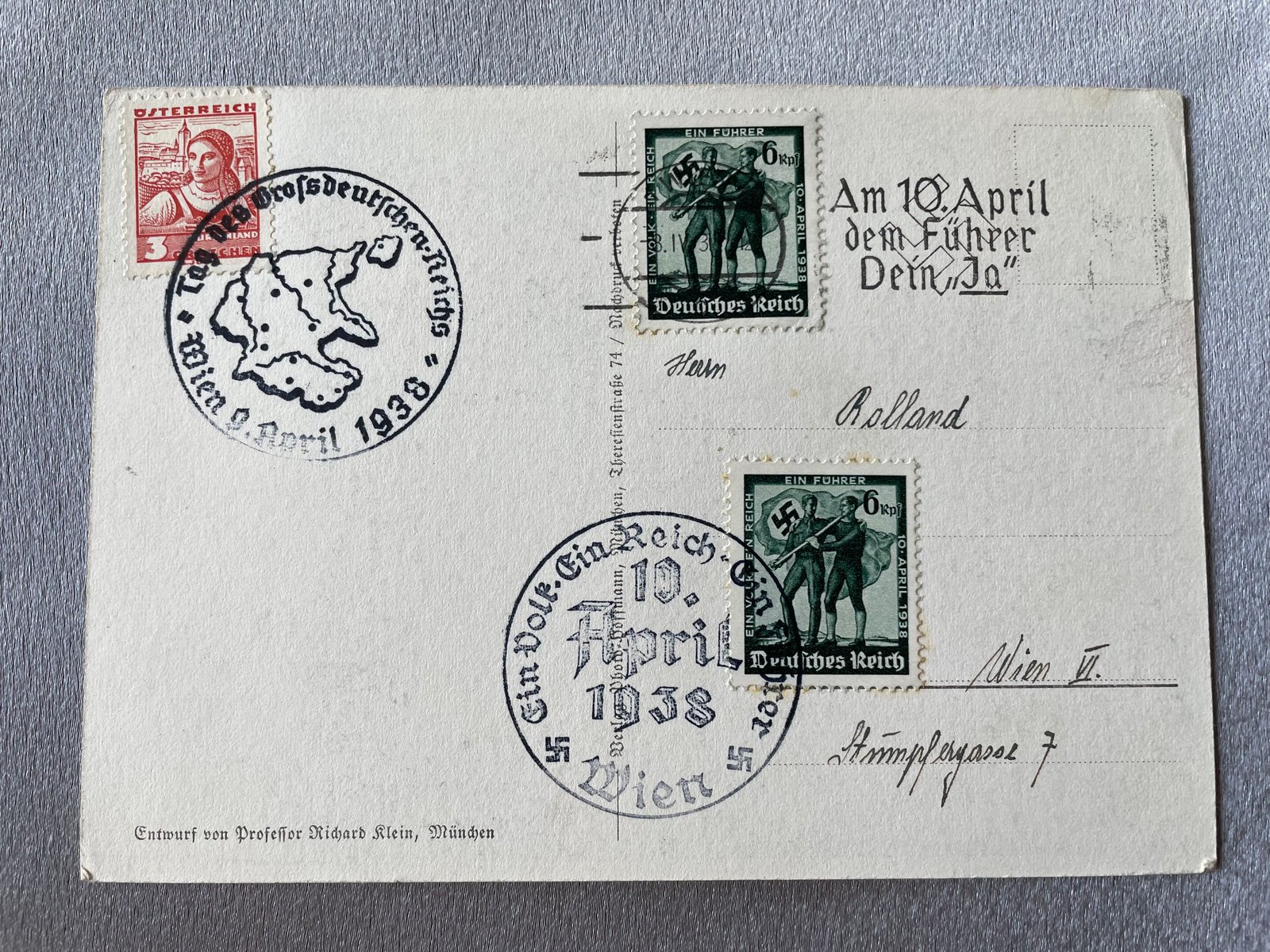 13 März 1938 Ein Volk Ein Reich Ein Führer Postcard. First card like this I have seen with no imprinted stamp and marked "Richard Klein", same card design do not show these traits.