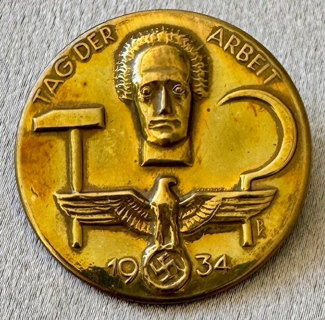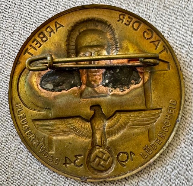 1934 Tag Der Arbeit Tinnie, reverse marked "Pleuger & Voss Lüdenscheid", metal pinback, 35mm