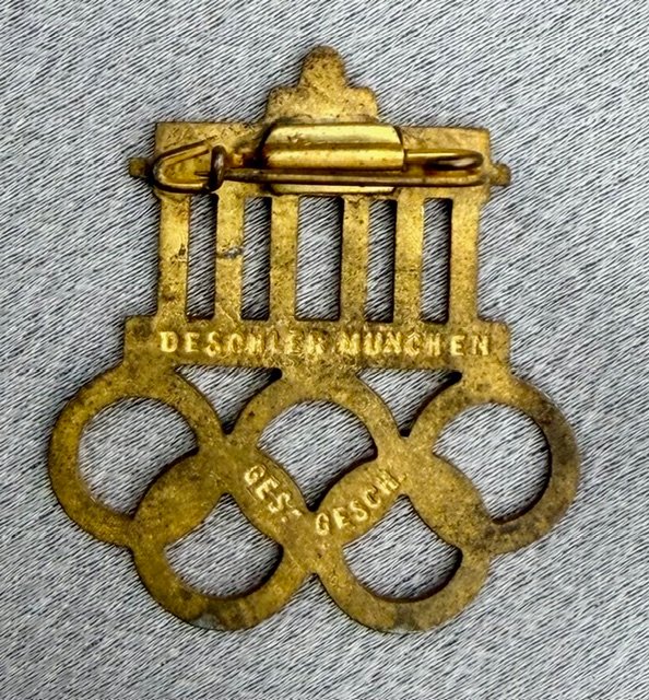 1936 XI Summer Olympic Games Berlin Pin, metal/enamel pinback, reverse maker marked "DESCHLER MUNCHEN" and "GES. GESCH.", 30 mm x 33 mm