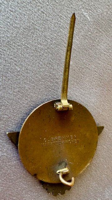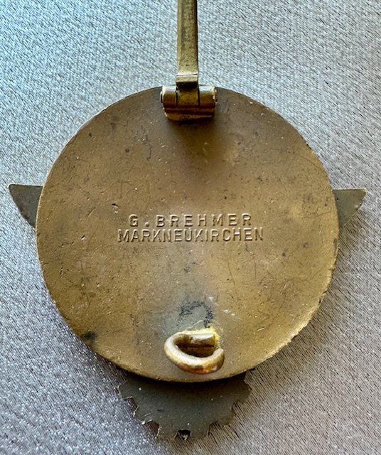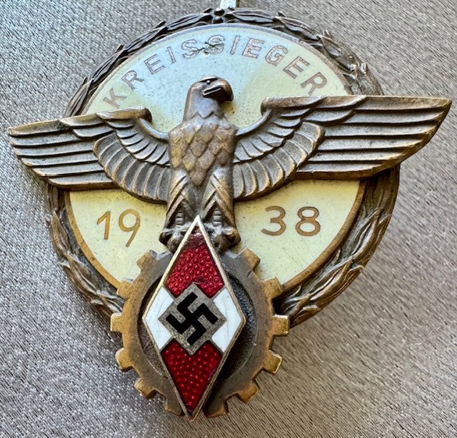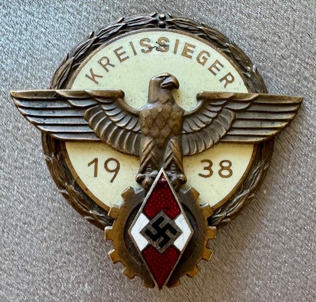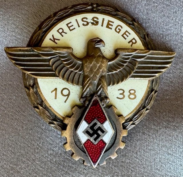 1938 HJ Kreissieger Badge by "G. Brehmer, Markneukirchen" construction with soldered on tombak eagle and enamelled surface and diamond. Maker marked on the reverse.