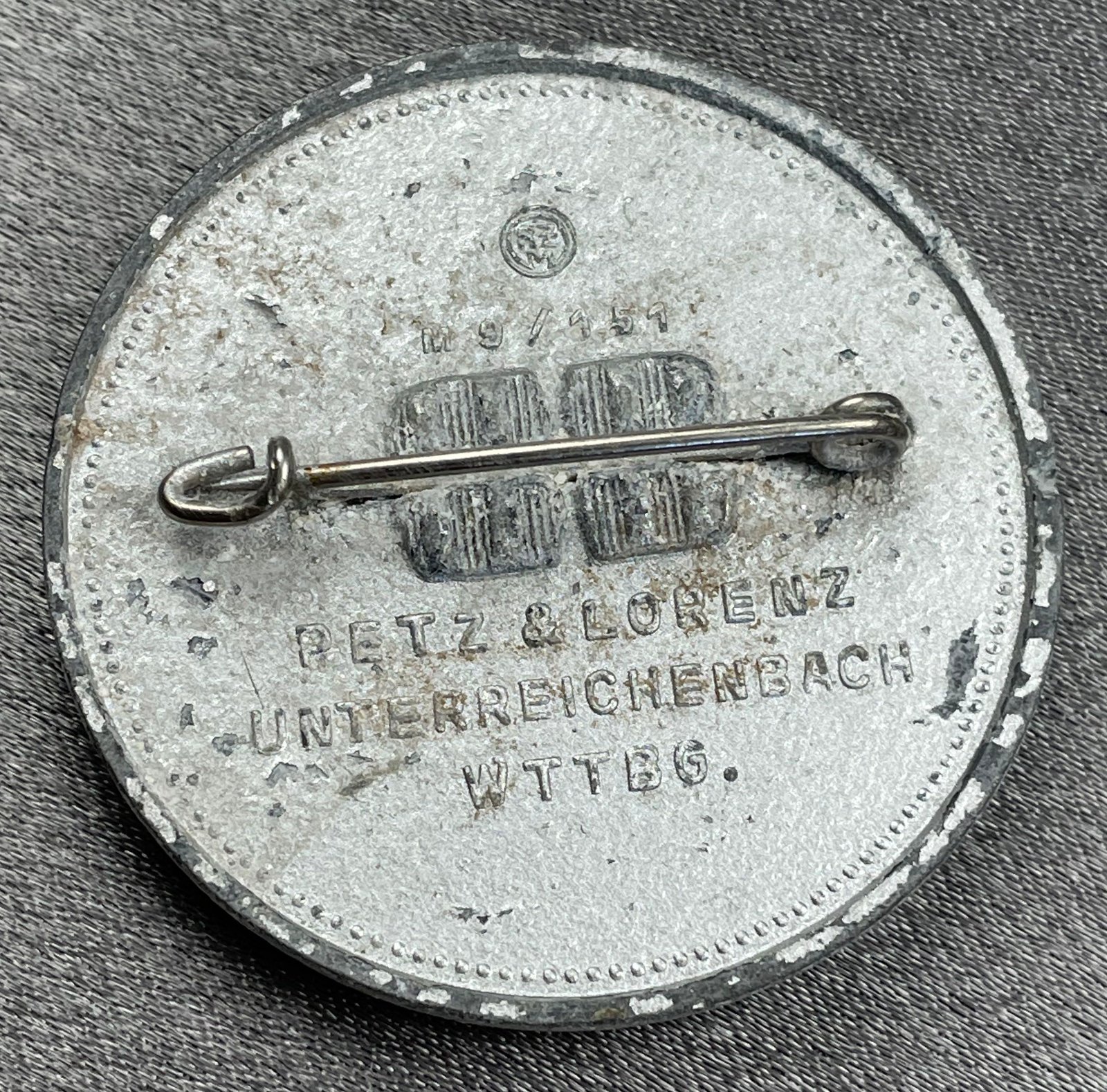Silver colored metal pinback 1939 Reichsparteitag Tinnie. Maker marked to reverse.