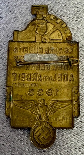 Adel der Arbeit Tinnie. Es wird künftig nur noch einen Adel geben - Adel der Arbeit - Adolf Hitler 1933. Metal pinback. 26mm x 51mm