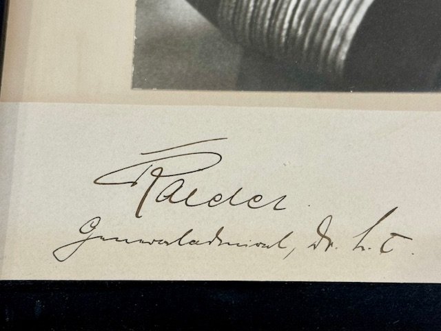 Admiral Erich Raeder Photo with a cut off paper having his period signature. Post war framed, approx. 13 1/2" X 17 3/4" in size