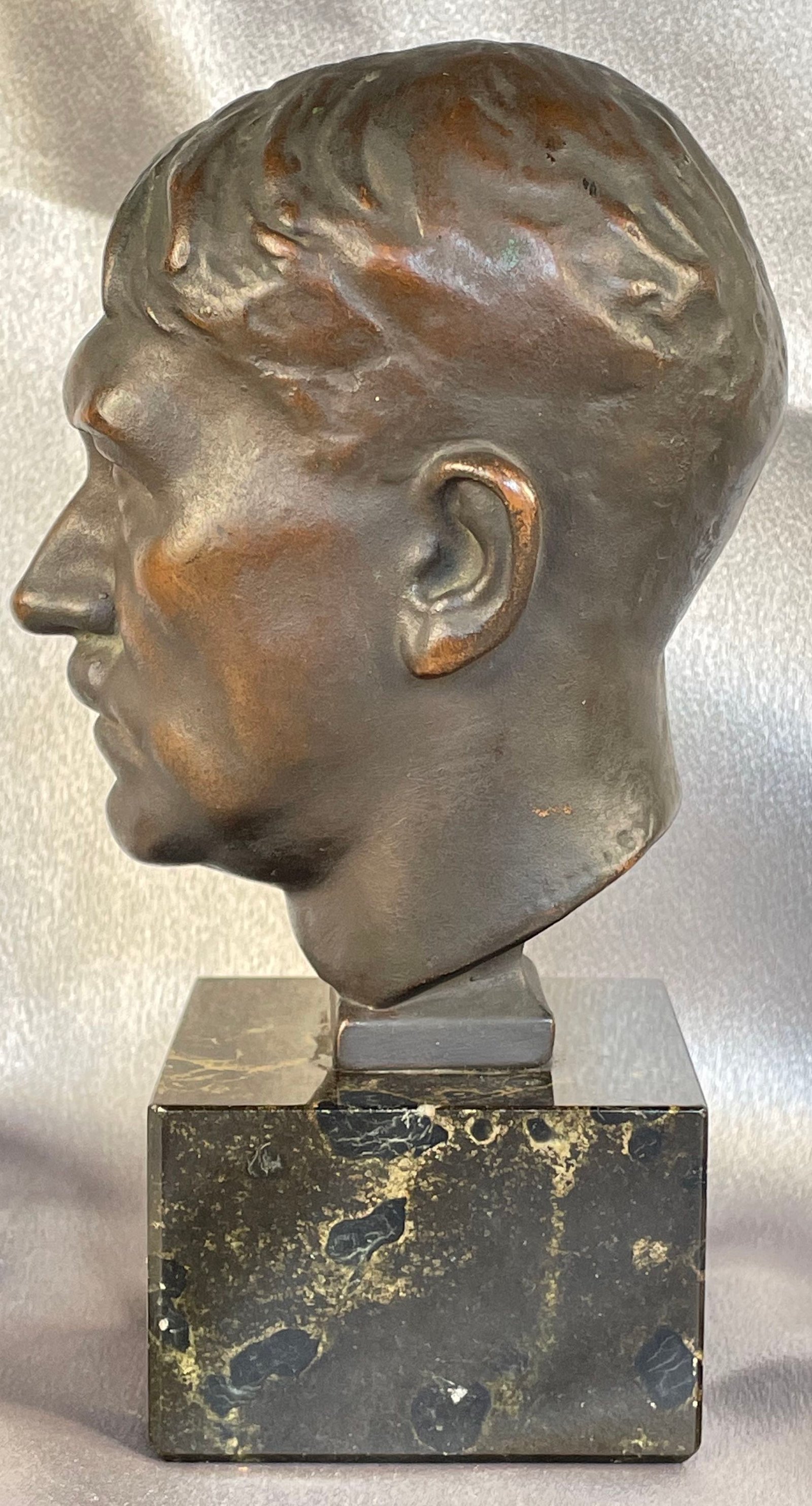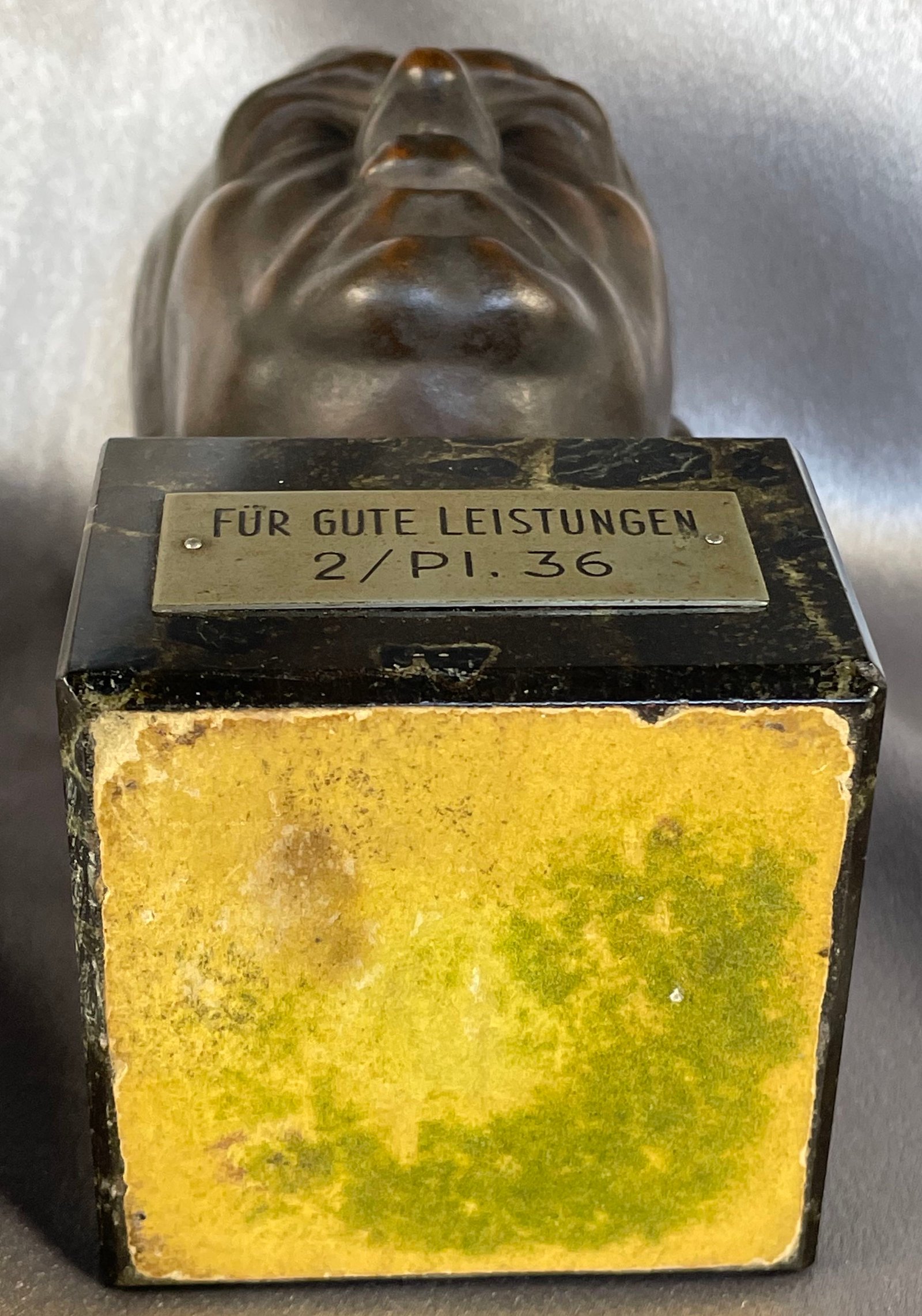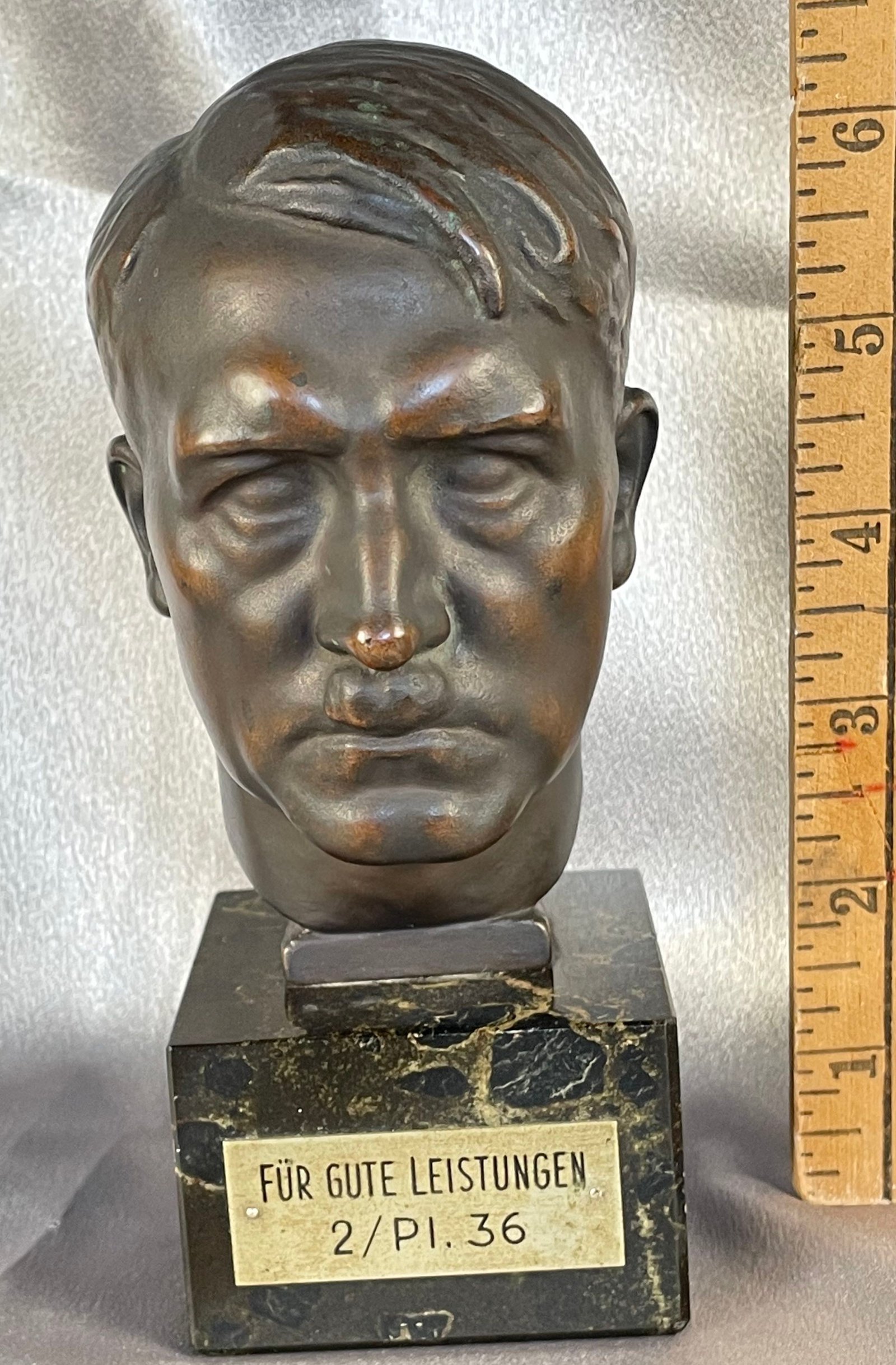 A small sized Adolf Hitler head bust on period marble with plaque reading, "Für Gute Leistungen 2/PI. 36". Sold cast showing even wear, yellow felt covering bottom of base. Approx. 6 1/2 " tall, base is 2 5/8" x 2 5/8".