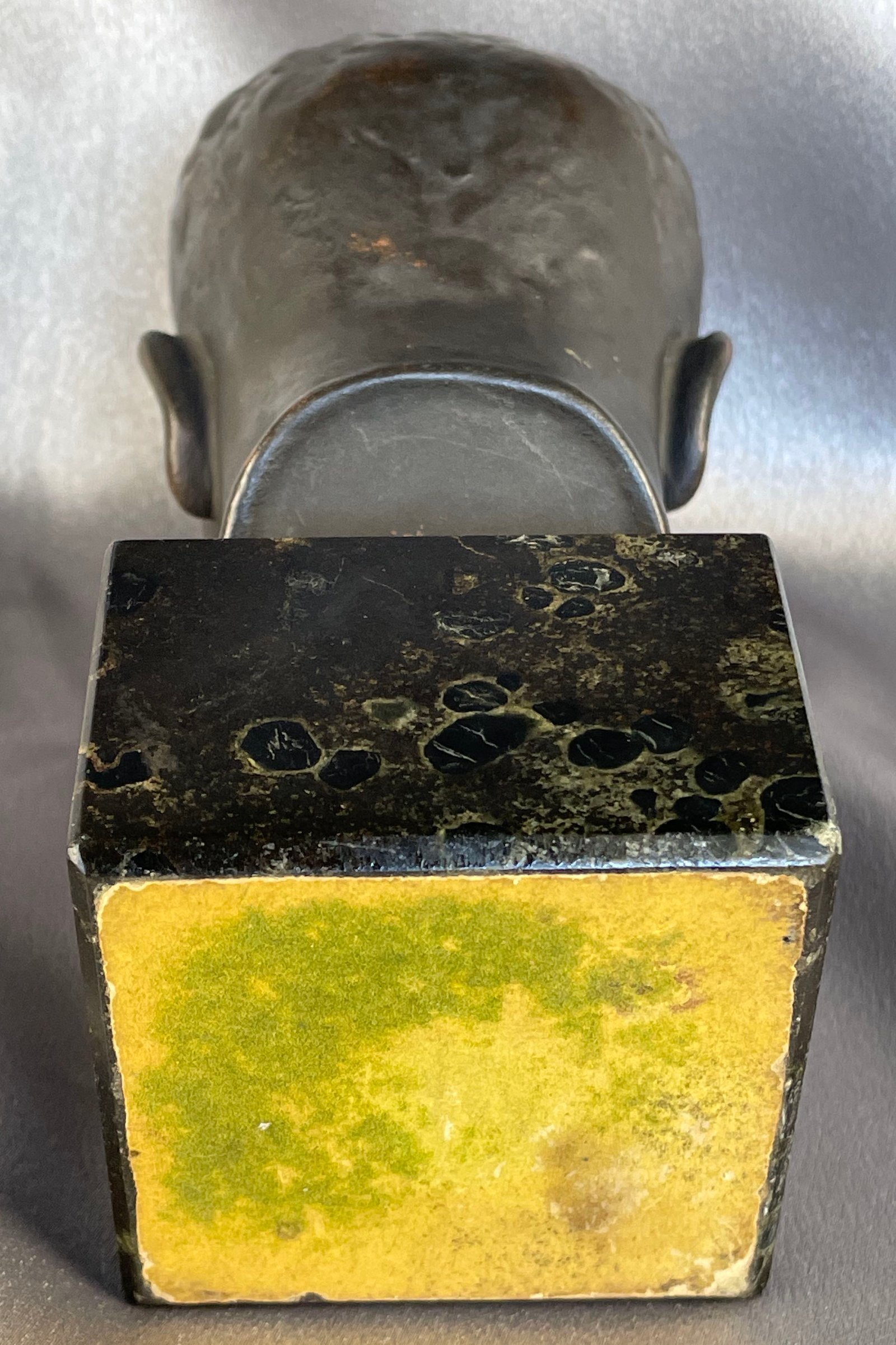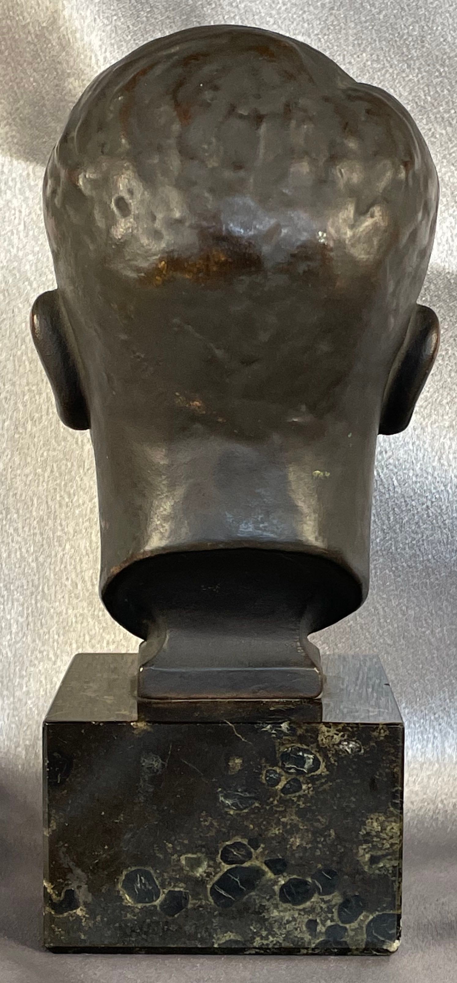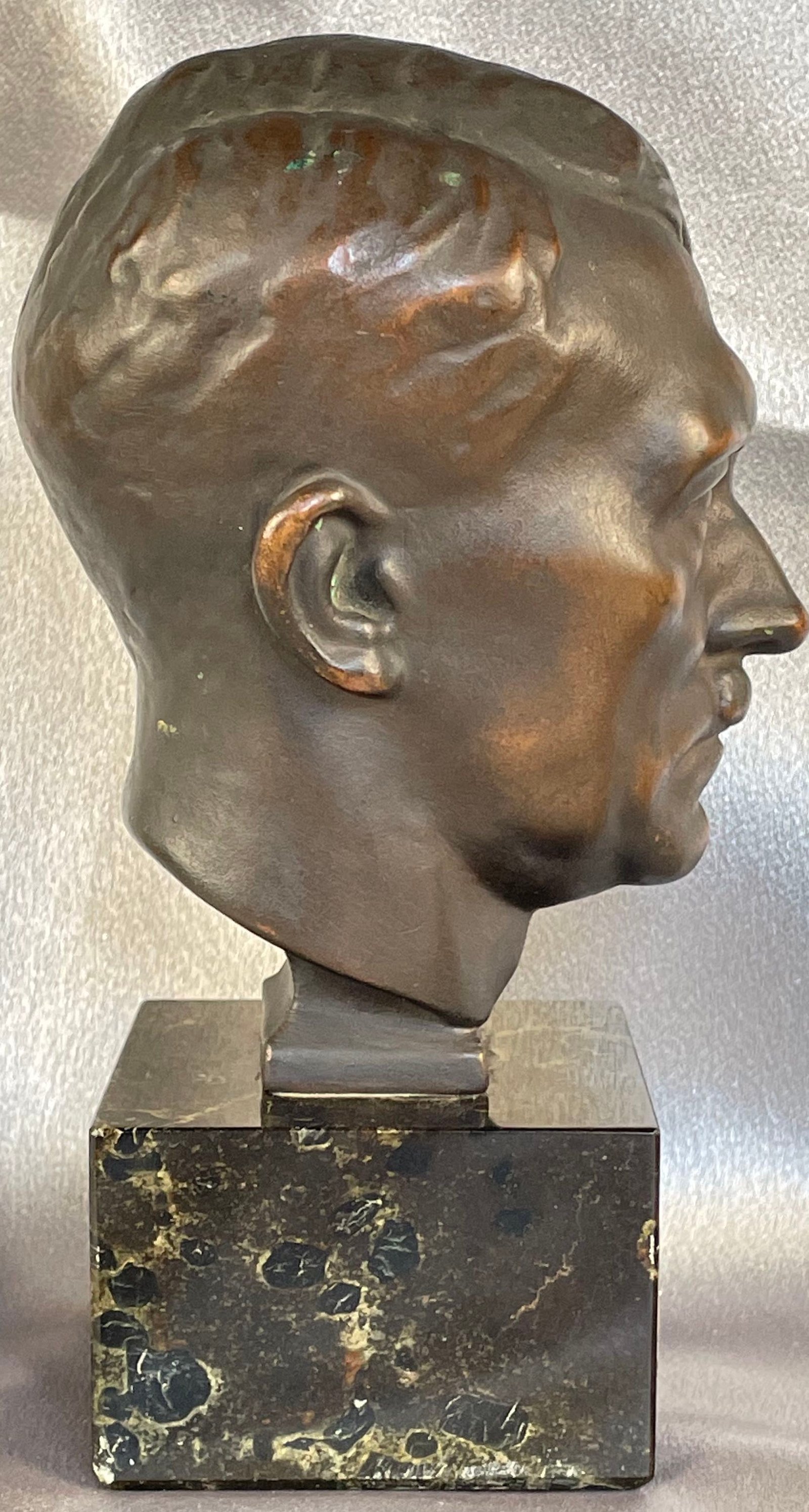 A small sized Adolf Hitler head bust on period marble with plaque reading, "Für Gute Leistungen 2/PI. 36". Sold cast showing even wear, yellow felt covering bottom of base. Approx. 6 1/2 " tall, base is 2 5/8" x 2 5/8".
