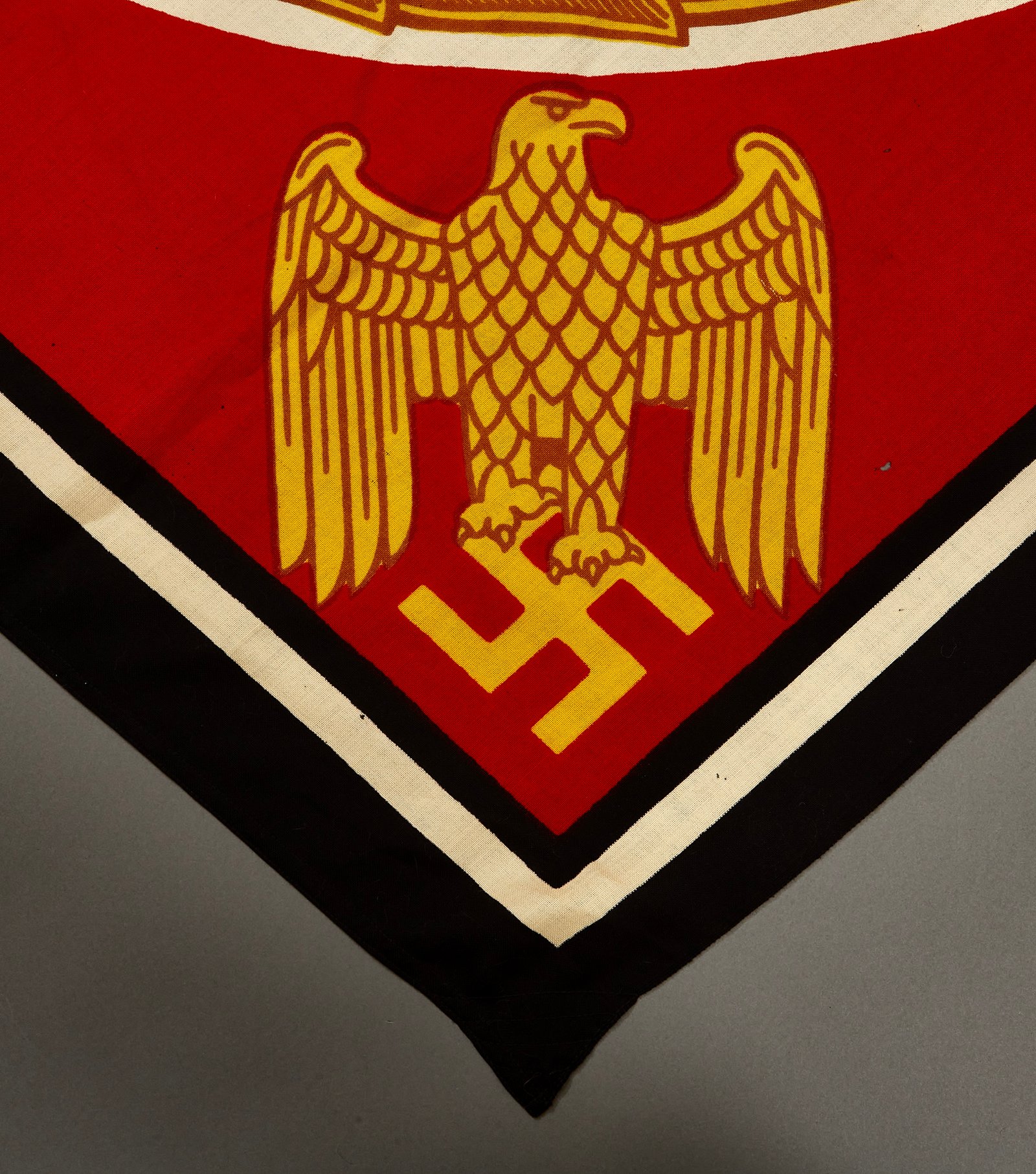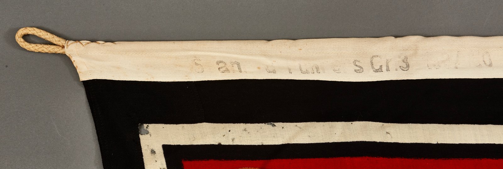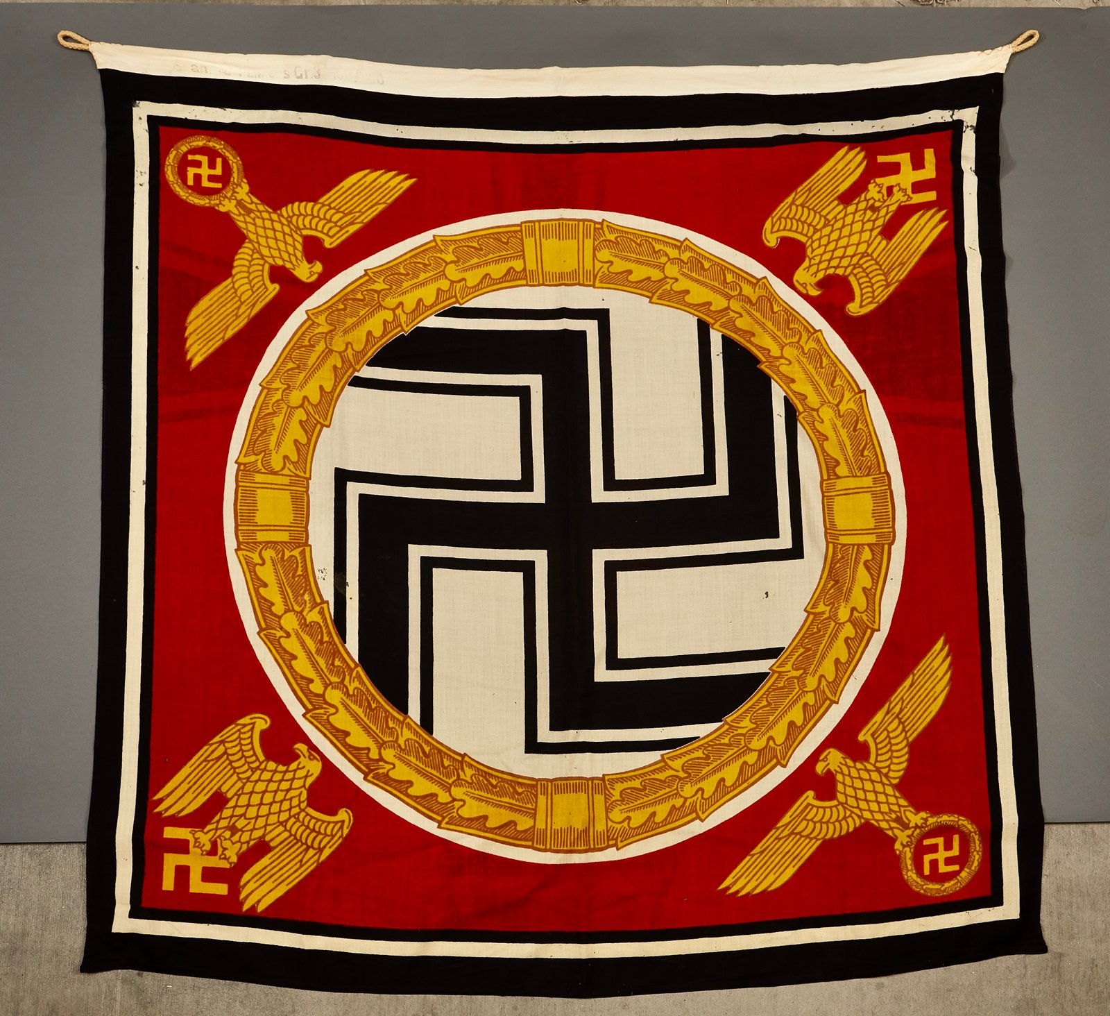 Adolf Hitler Führer Standard Flag. Standarte Des Führeres und Oberbefehlshabers der Wehrmacht (Standard of the Führer and Commander in Chief of the Wehrmacht). This type of flag was flown anywhere that Hitler was present. "Stand. d. Führers Gr. 3 150/150" was printed on the side along with maker tag "Würtemmbergische Cattunmanufactur Heidenheim a. Brz". The flag is approx. 60" by 60" in size. These flags were printed on a thin wool material and all have pin size holes from age and wear. This one retains its 2 rope loops. Rare to find.