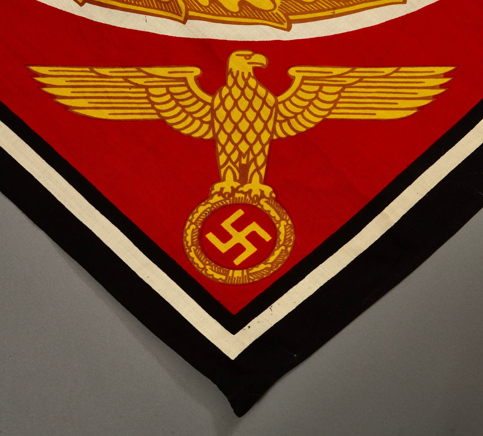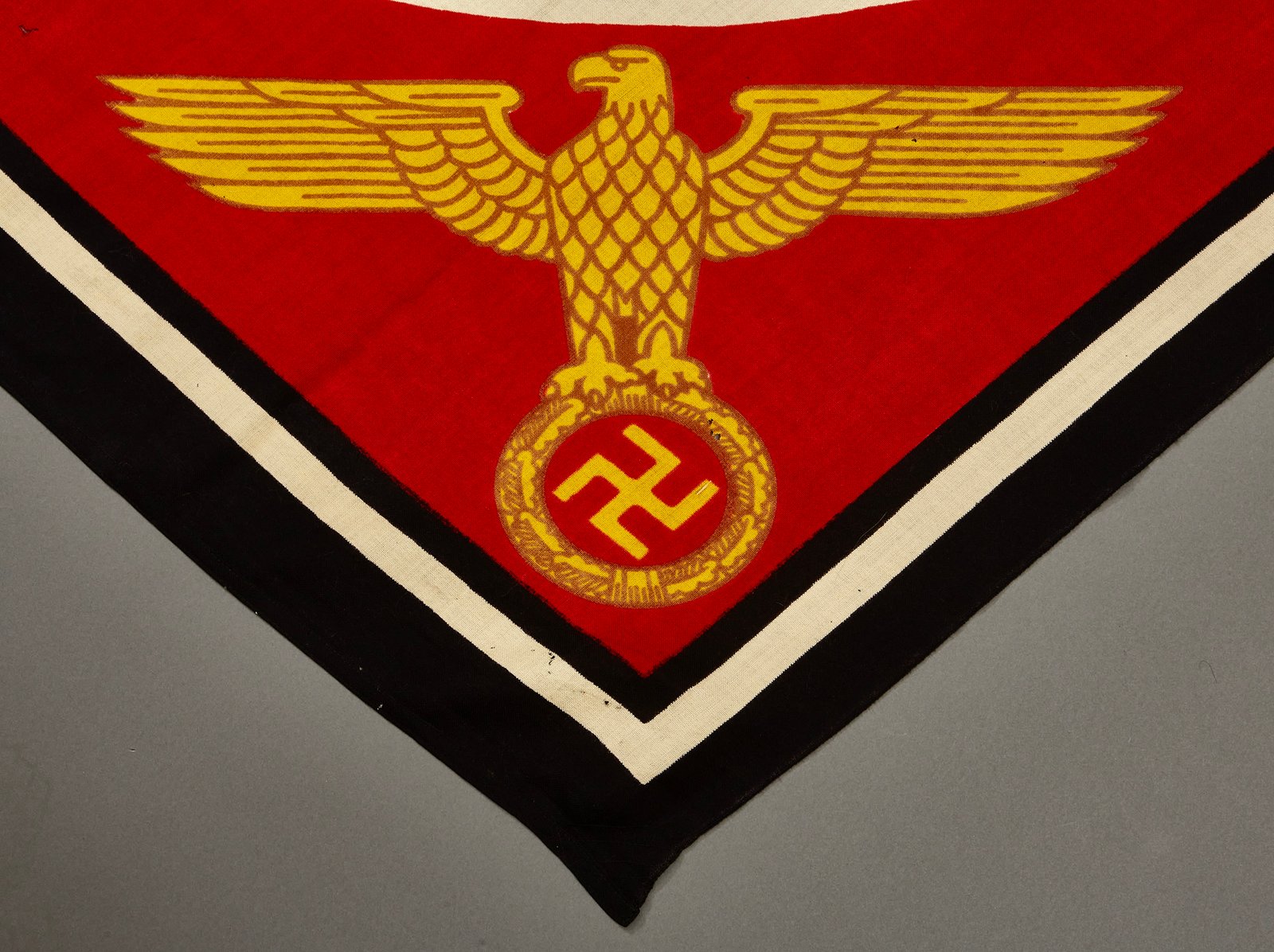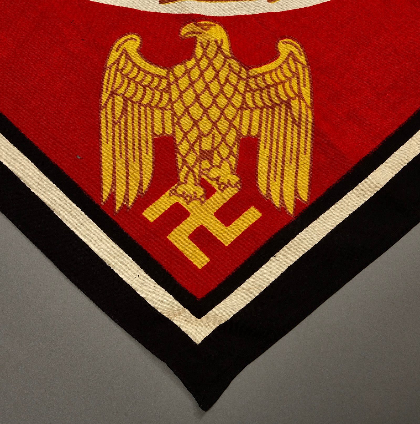 Adolf Hitler Führer Standard Flag. Standarte Des Führeres und Oberbefehlshabers der Wehrmacht (Standard of the Führer and Commander in Chief of the Wehrmacht). This type of flag was flown anywhere that Hitler was present. "Stand. d. Führers Gr. 3 150/150" was printed on the side along with maker tag "Würtemmbergische Cattunmanufactur Heidenheim a. Brz". The flag is approx. 60" by 60" in size. These flags were printed on a thin wool material and all have pin size holes from age and wear. This one retains its 2 rope loops. Rare to find.
