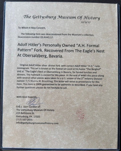 Adolf Hitler Formal Pattern Fork, "AH" eagle to front, "800" to reverse, 8 1/2" in length, previous owner bought this from Gettysburg.