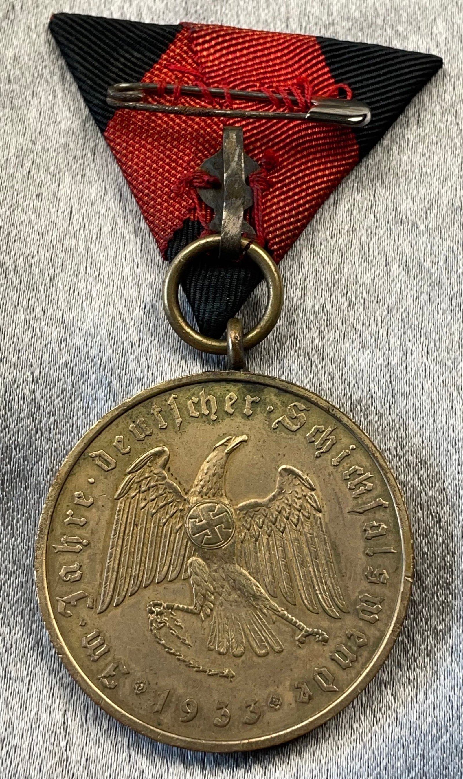 Bust of Hitler facing left surrounded by inscription in German, "Ours the Future-Adolf Hitler". Reverse device is eagle with broken shackels and inscription in German, "In the year of the turn of German destiny, 1933". Struck in gilt plated metal. 36mm. C-30 in Colbert-Hyder book. Struck to side "BAYR. HAUPTMUNZAMT". Loop was added period(?) along with unknown pin back ribbon.