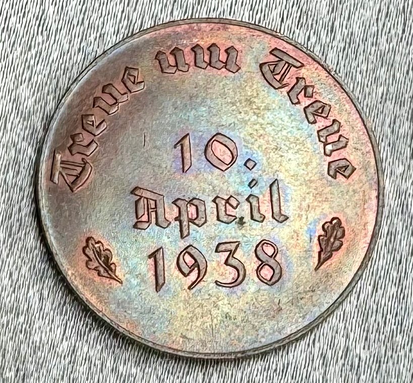 Reverse reads "Treue um Treue 10. April 1938", 23mm in copper.