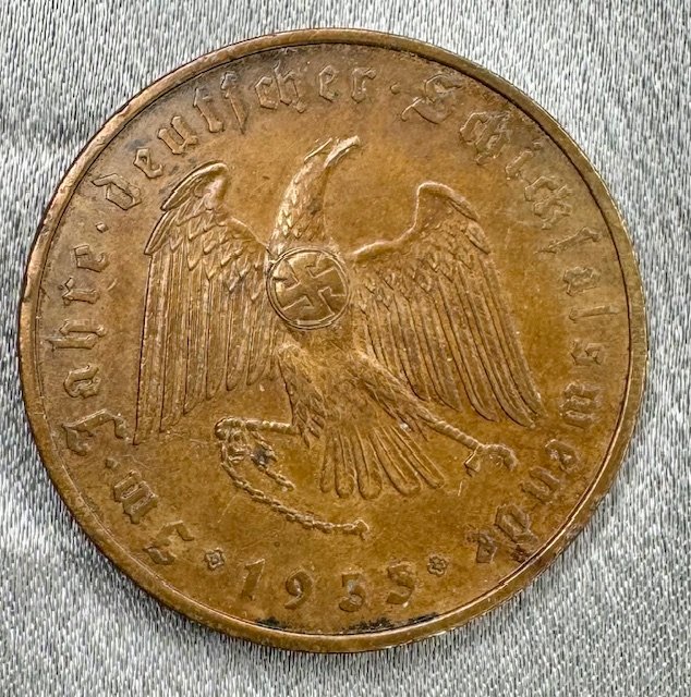 Bust of Hitler facing left surrounded by inscription in German, "Ours the Future-Adolf Hitler". Reverse device is eagle with broken shackels and inscription in German, "In the year of the turn of German destiny, 1933". Struck in gilt plated metal. 36mm. C-30 in Colbert-Hyder book. "BAYER.HAUPTMUNZAMT" stamped into side.