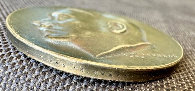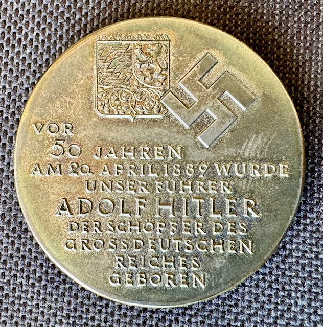 Bust of Hitler facing left with artist signature on the lower right: "Krischker/1939". Reverse in German translates: "50 years ago on April 20, 1889 our leader, Adolf Hitler, creator of the greater German empire, was born. Struck in silver, cased, 36mm. Hallmarked to side "835 PR MÜNZE BERLIN". C-117 in the Colbert-Hyder book.
