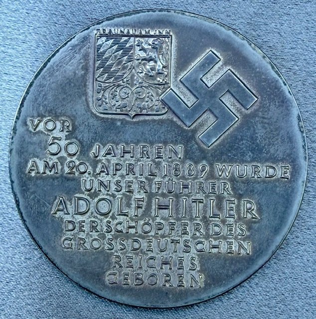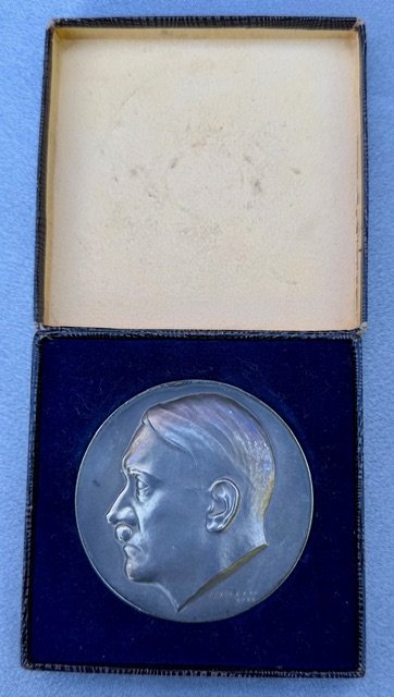 Adolf Hitler Medallion. Bust of Hitler facing left with artist signature and date on the lower right: "Krischker 1939". Reverse in German translates: "50 years ago on April 20, 1889 our leader, Adolf Hitler, creator of the greater German empire, was born". Struck in silver, bottom edge marked "835 PR. MÜNZE BERLIN" with the 1/2 moon symbol proceeding, 60mm. With original period box. C-117 in the Colbert-Hyder book.