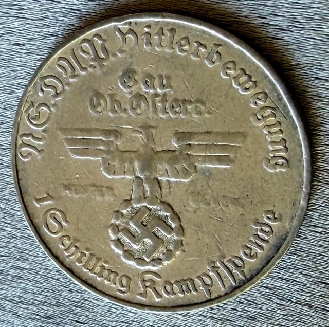 Adolf Hitler Token. Front shows Hilter with inscription "Der Führer Des Deutschen Volkes", Reverse shows eagle and "NSDAP Hitlerbewegung 1 Schilling", 30mm