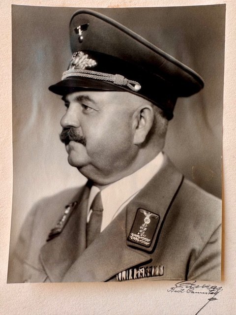 Alfred Arnold Sr. Studio Portrait, 9 3/4" X 13 3/4", shown wearing his Gauleitung tunic and visor. Alfred Arnold Sr. was born in Ellhofen on 16.6.1888. From 1907-1909 he served voluntary with in the 29th field-artillery-regiment. He worked as a self-employed farmer 1914-1916. He was a soldier in 1916 when he became Unteroffizier in the 1. Batterie of the 65. replacement field-artillerie-regiment. In 1931 he became member of the NSDAP, Nr. 595088; he also became special district advisor and speaker of the NSDAP farmers in 1932. He became member of the Württembergische Landtag on 12.11.1933 and member of the Reichstag. In 1933 he was agricultural advisor of the Gau Würtemberg; agricultural Staatskommisar; leader of the Würtembergische farmers. In 1934 he joined the SS, Nr. 14671601.02. with the rank of SS-Hauptsturmführer, 20.04.1934 SS-Sturmbannführer, Staff SS Rasse- und Siedlungshauptamt (racial- and settlement main office), 20.04.1935 SS-Obersturmbannführer, 1935-1942 Rasse und Siedlungshauptamt, 15.09.1935 SS-Standartenführer, 30.01.1937 SS-Oberführer, 09.11.1942 SS-Brigadeführer; Gau-office leader (Gau-Amtsleiter) for the land people in the Gau Würtemberg-Hohenzollern, Gau-Haupt-Abschnittsleiter1944 Staff SS-Oberabschnitt Main. Arnold survived the war and ran a building business.