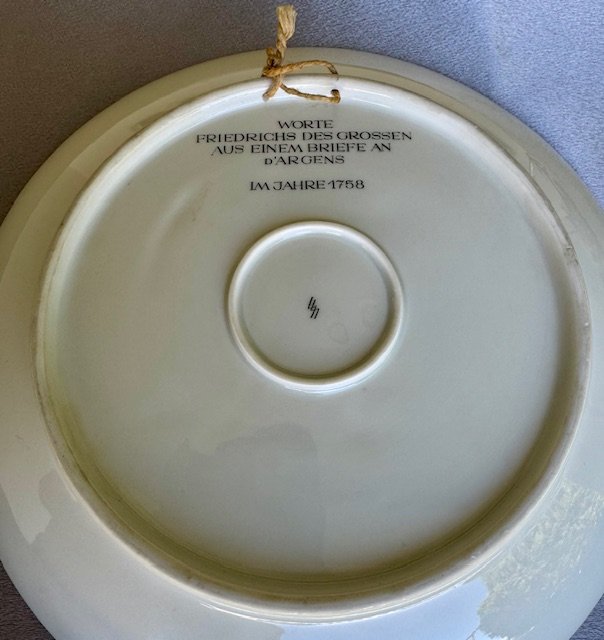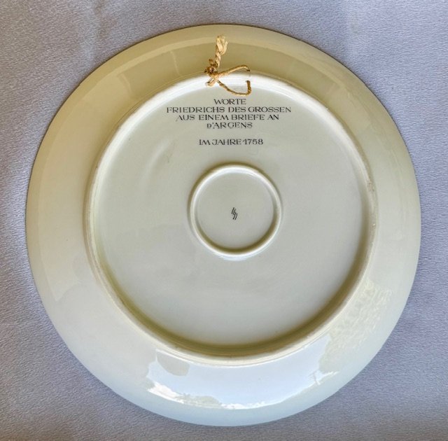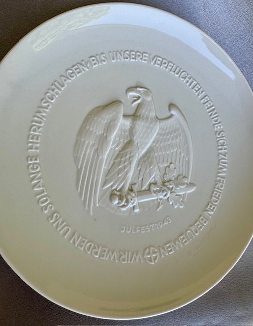 Allach Porcelain 1943 Juhlfest Plate. A very nice mint, undamaged, never repaired Julfest plate for 1943, measuring approx. 10 inches. Himmler Presentation Julfest 1943 plate, presented to parties on his personal lists and to illicit favors. Rear of plate bears the quote from Frederick the Great which translates to "We have to fight our enemy until they surrender for peace", allach maker marked as shown