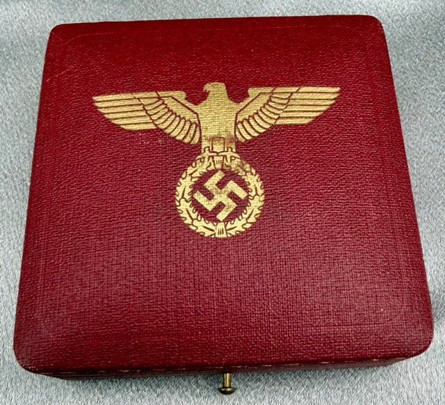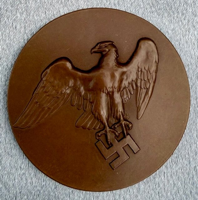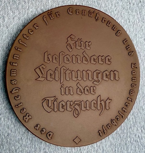 Cased bronze medallion, 50mm. Obverse shows an eagle and swastika, reverse is inscribed "Für Besondere Leistungen in der Tierzucht Reichsminister für Ernährung und Landwirtschaft ". Cased has eagle and swastika to teh front, reverse is maker marked "Preuss. Staatsmünze Berlin C.2"