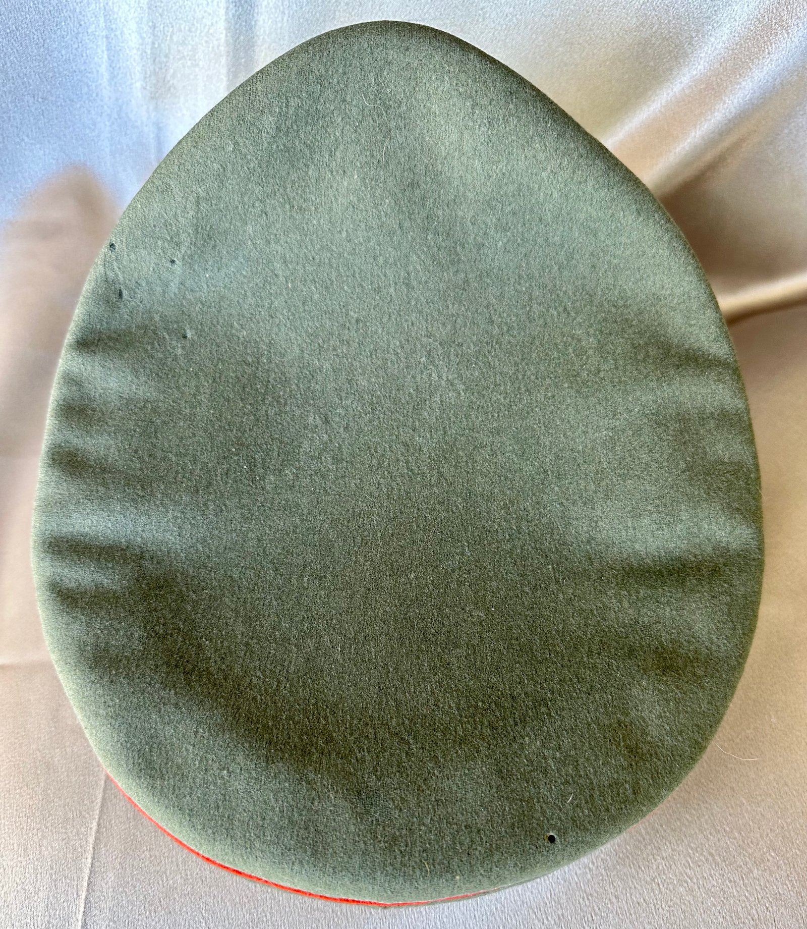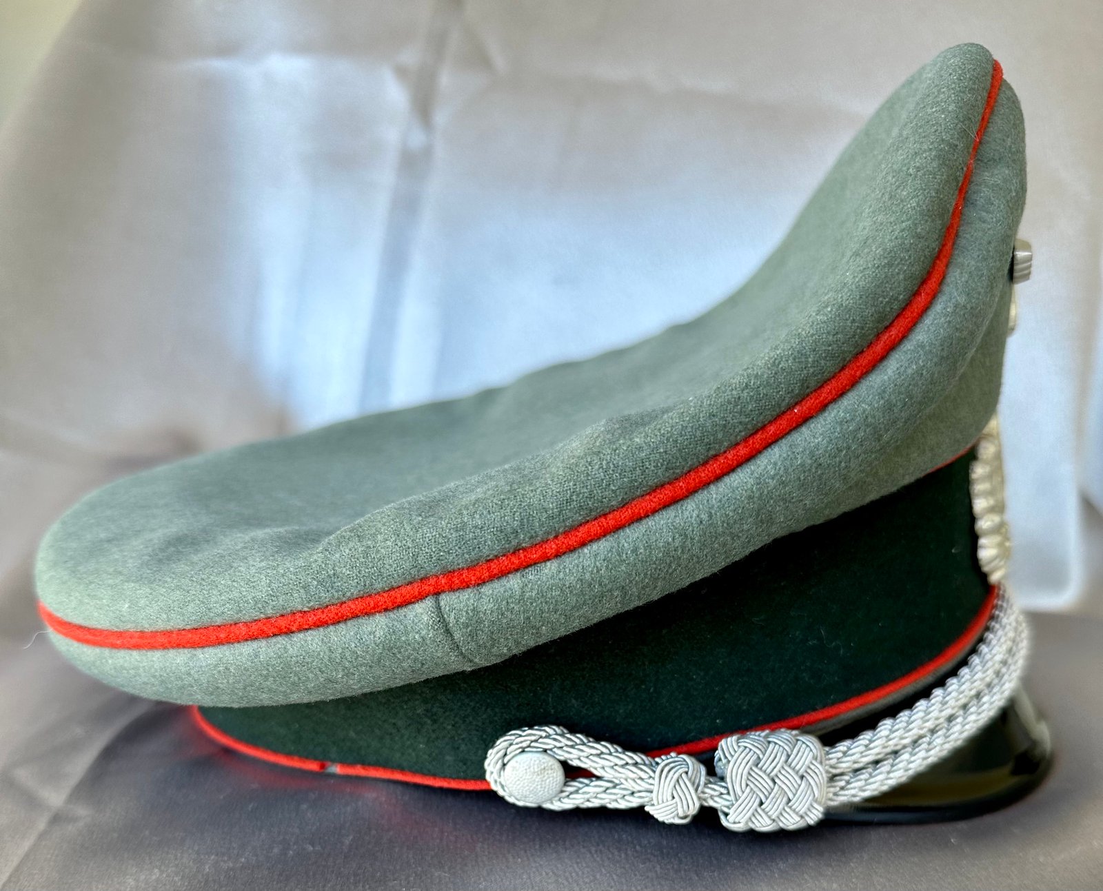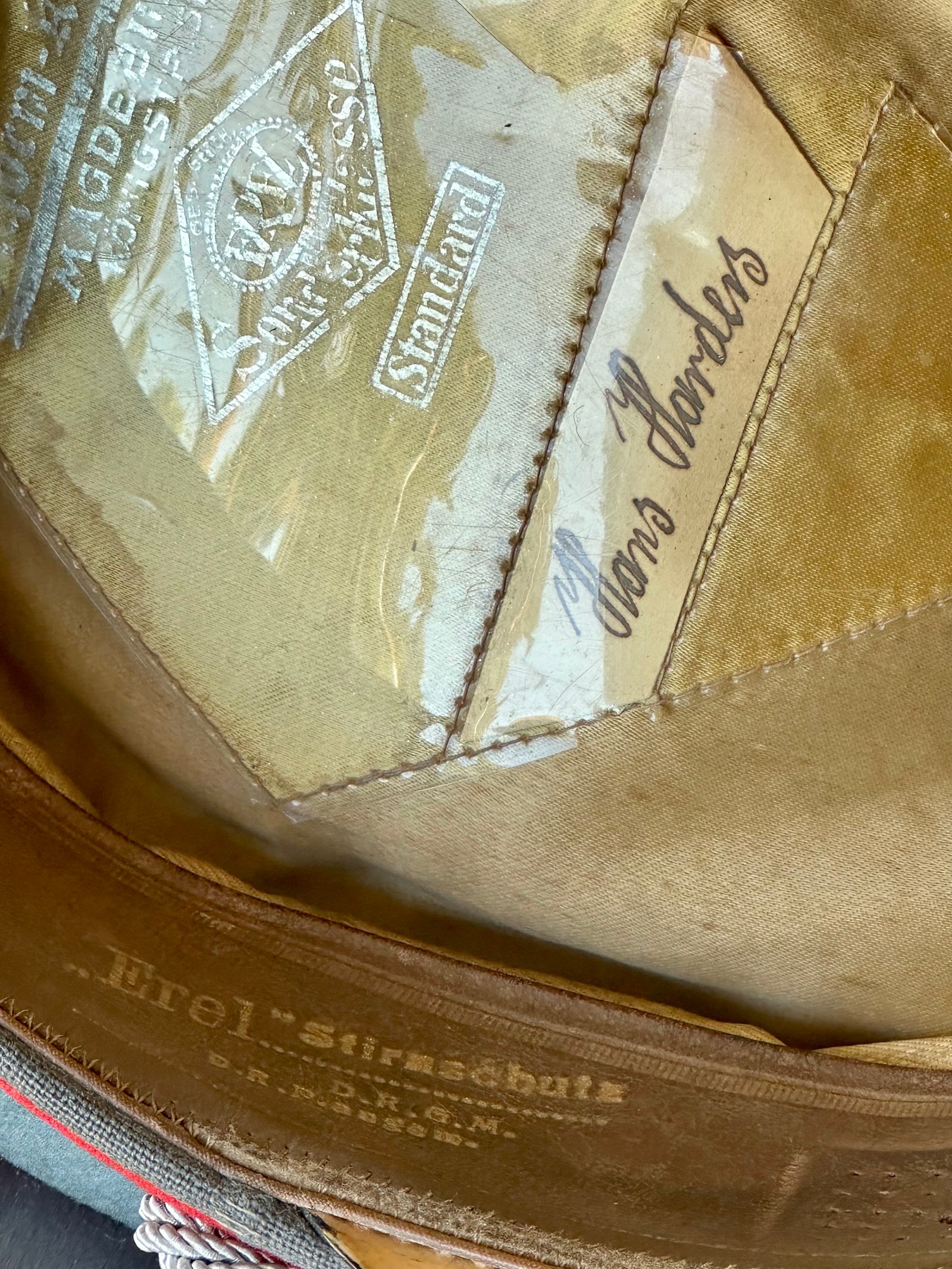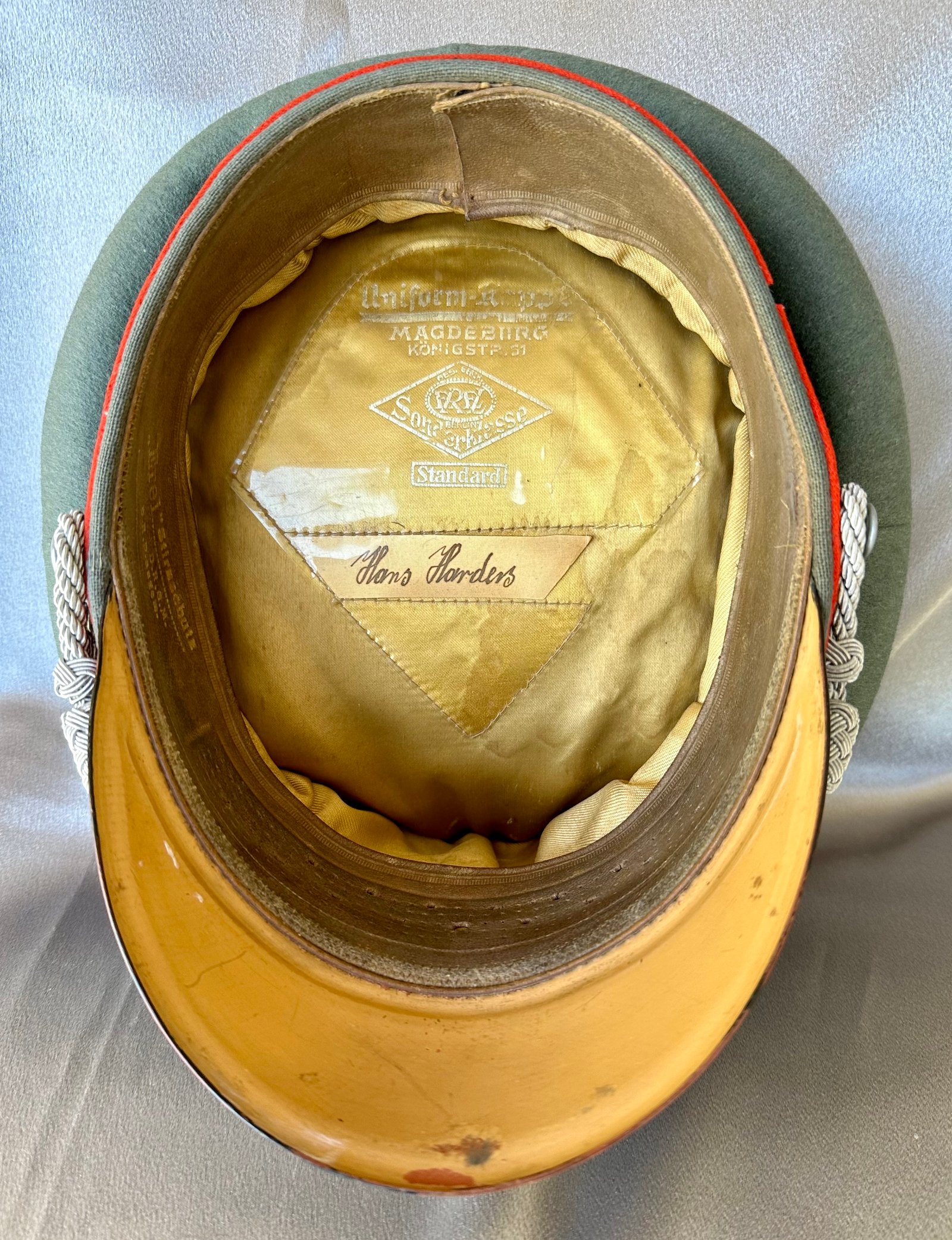 Artillery Officers Visor, Double Erel interior and sweat diamond, with distributor's logo. High quality doeskin, size 56, Named to Hans Harders, an officer who can be researched further. Excellent condition!