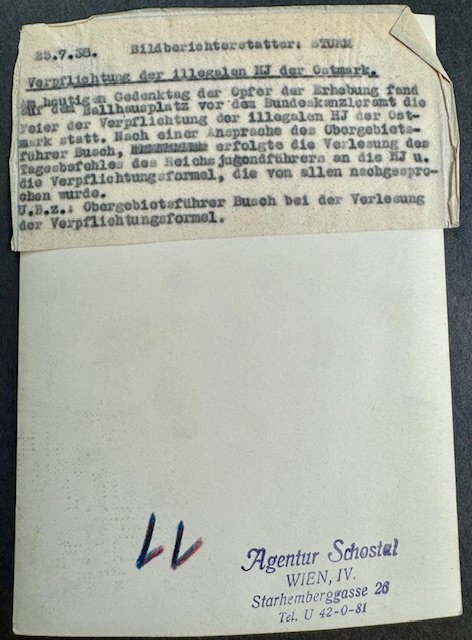 Commitment and honoring of Austria's illegal Hitler Youth (prior to the Anschluss). This photo was taken in front of the Austrian Federal Chancellory and shows then Gauleiter Odilo Globocnik on July 25 1938, press photo, approx. 5" X 7" in size.