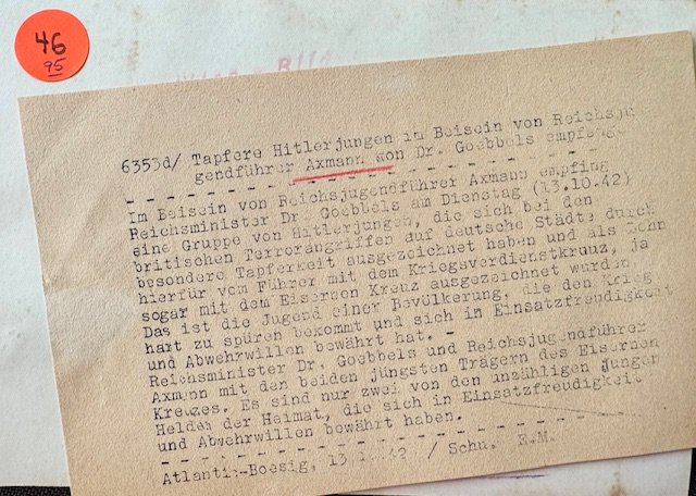 Brave Hitler Youths received by Dr. Goebbels in the presence of Reich Youth Leader Axmann. Press photo, approx. 7" X 5" in size.