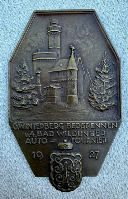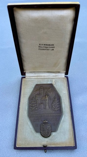 Cased bronze metal plaque for 6. Winterberg Bergrennen u.4. Bad Wildunger Auto Tournier 1927 (6th Winterberg Hill Climb and 4th Bad Wildungen Car Tournament 1927). Plaque is 52mm x 85mm, maker marked to reverse "F. Wiedmann Frankfurt M.", case in excellent condition.