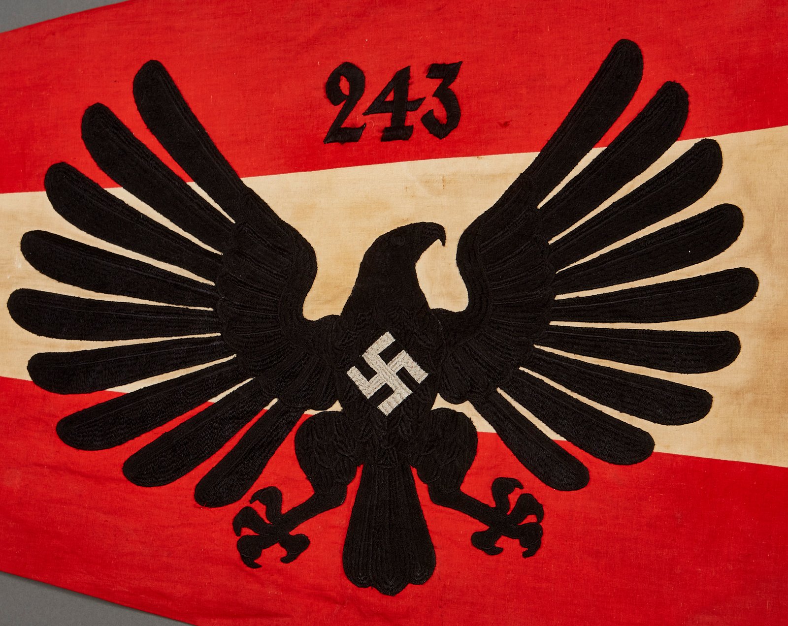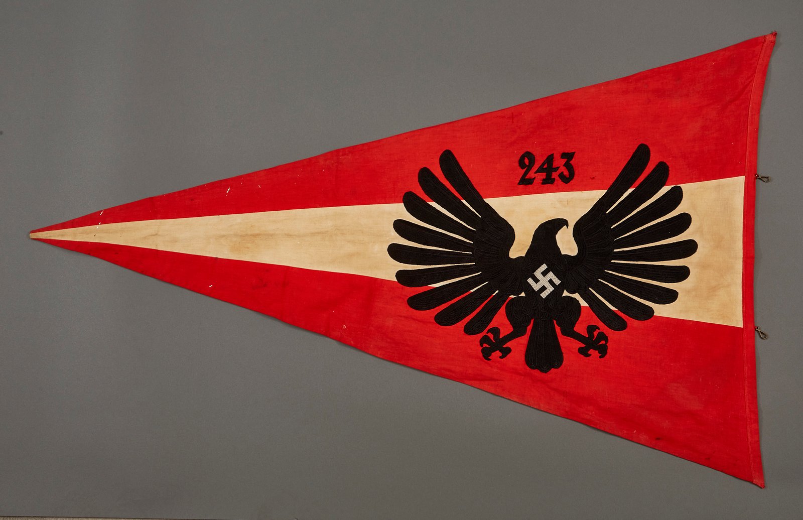 BDM Untergau Pennant for 243 which is West-Westfalen in Neuwied. Excellent condition, heavy embroidery 2 clips missing, approx. 30" X48" in size