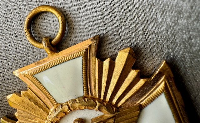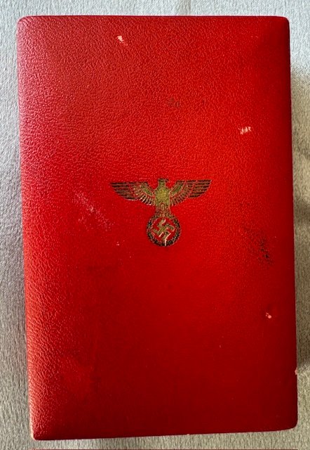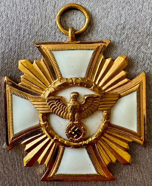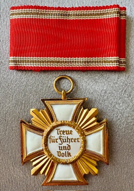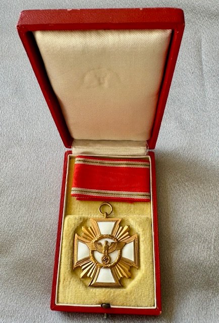 Cased NSDAP 25 year long service medal (NSDAP Dienstauszeichnung in Gold). Thin two piece tombak construction. Ring maker marked with the RZM suffix code "19" for "Wilhelm Deumer of Lüdenscheid". Excellent condition with white enamel completely intact. With the original matching ribbon as it was presented. No repairs, no damage, 100% textbook. Investment quality!