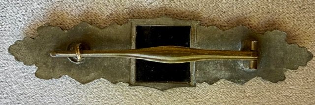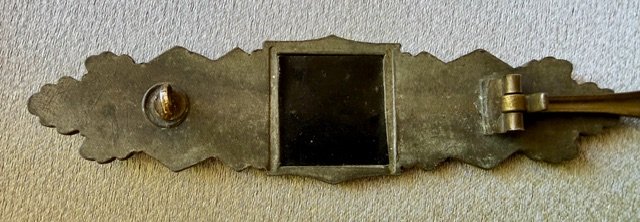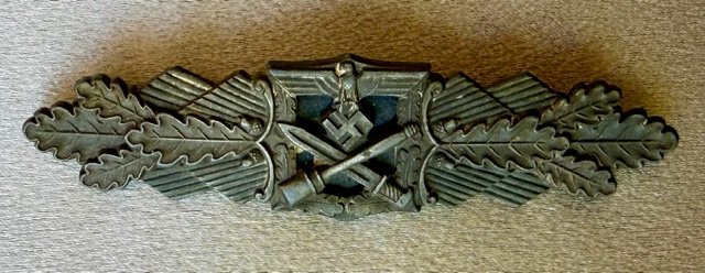 Close Combat Clasp in Bronze (Nahkampfspange in Bronze), constructed of bronzed zinc, the reverse has a crimped hinge and fluted banjo style pinback, unmarked but demonstrating the characteristics of a variant credited to Steinhauer & Lück, Lüdenscheid, excellent condition.
