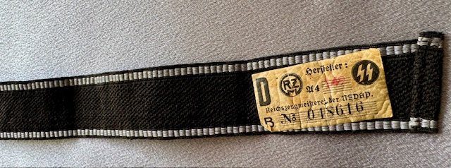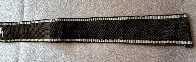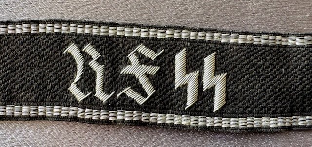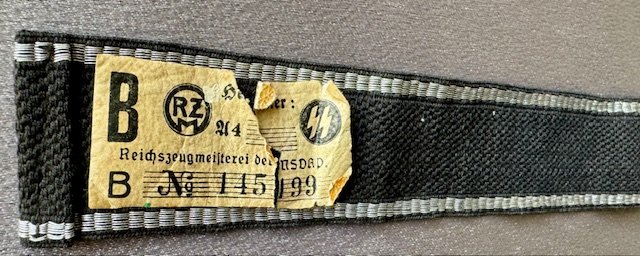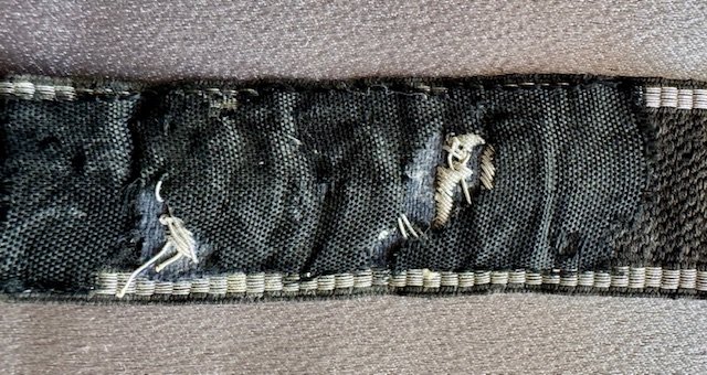 Cuff Title for Personnel Staff of the Reichsführer SS, Officer, 2nd Pattern. Black band with silver aluminum 7 thread borders, at centre "RFSS" embroidered in silver aluminum Gothic script. Both ends finished with two white paper SS/RZM tags, full length 19"