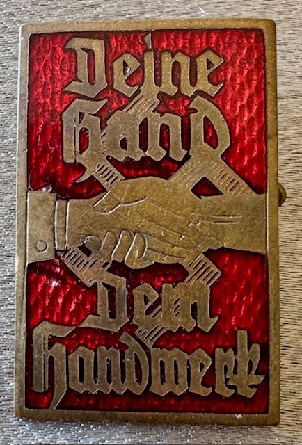 Deine Hand dem Handwerk Badge, maker marked to reverse, enamel/metal pinback
