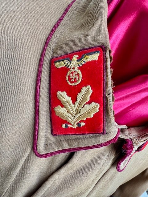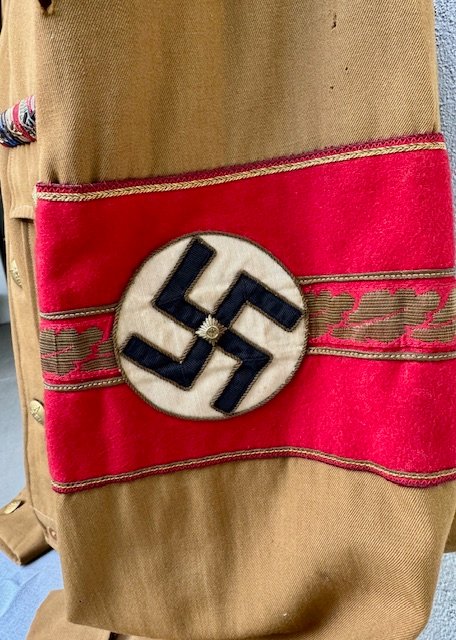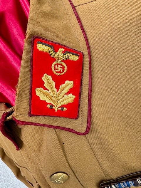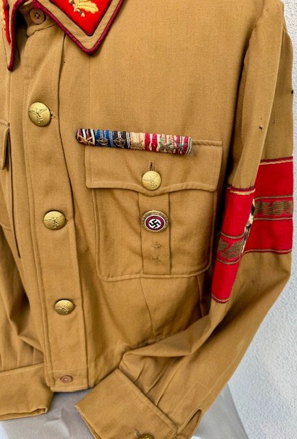 Deputy Gauleiter Brownshirt with embroidered collar tabs for Befehlsleiter. The blood order ribbon is correctly period sewn on. There is padding within the shirt above the right shoulder, indicating the owner may have had a should injury or defect. Signs of wear to the material as shown, medals not included, out of my personal collection. A previous owner's family had a gas station on the local interstate in PA back in the 1960's and 70's. Out in front of the station they had a big sign which read: "Buying War Souvenirs--Will Trade For Gas". Many years ago, during their heyday they were buying militaria constantly. This was acquired directly from the veteran in this way.