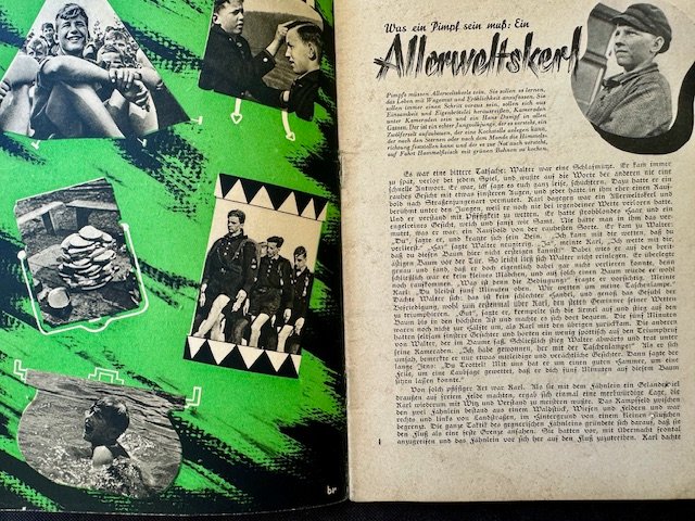 Der Pimpf Juli 1938 Folge 7. Der Pimpf was the monthly magazine for boys 10-14 years old in the Hitler Youth organization. The first issue appeared in 1935 under the title "Morgen". The title changed to "Der Pimpf" with the April 1937 issue. It contained a mixture of adventure stories and photos. Nice condition.