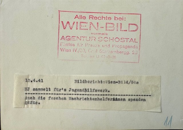 "HJ collects for the youth welfare organization. The pretty news assistants are also happy to donate". This press photo was taken on April 10 1941, approx. 5" X 7" in size.