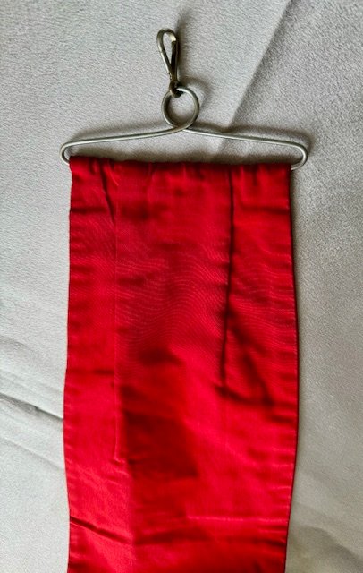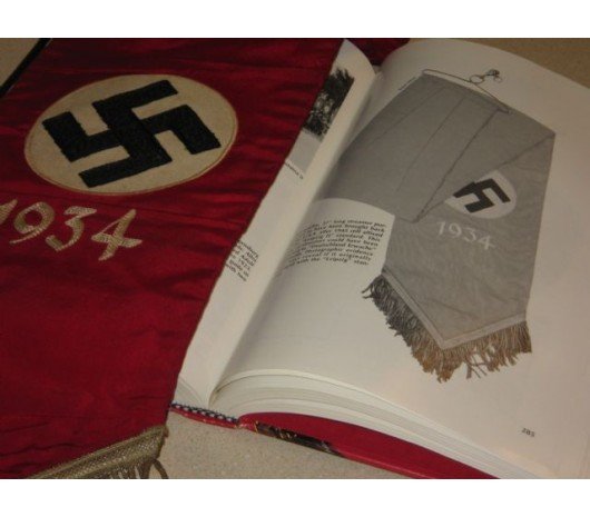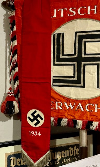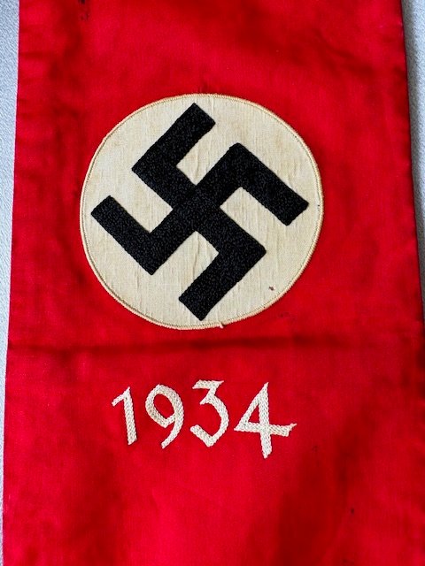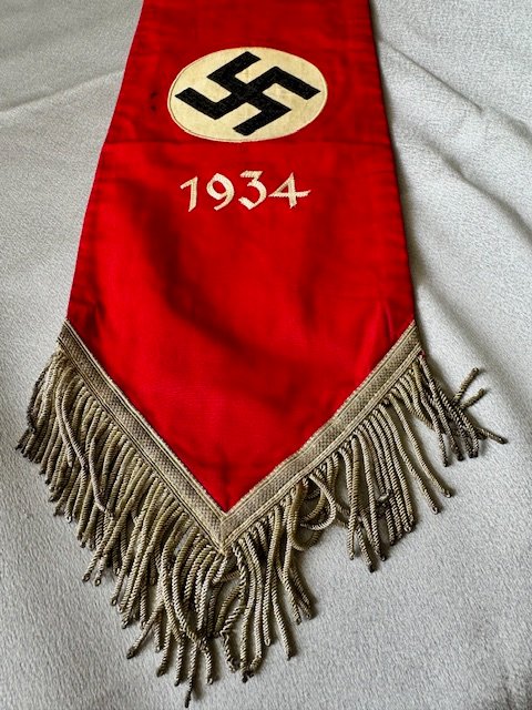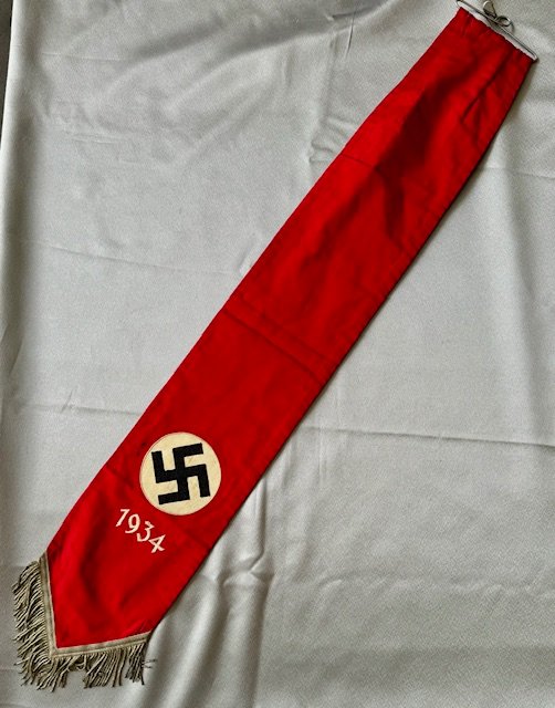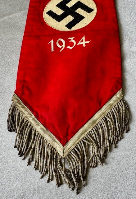 Here is a very rare accessory to the Deutschland Erwache standarte, a streamer used only during the 1934 Party Day. This is an extremely rare, exotic piece. An example of this streamer can be found in Ulric of Englands comprehensive DE reference book, on page 285. Approx. 6" X 38" in size.