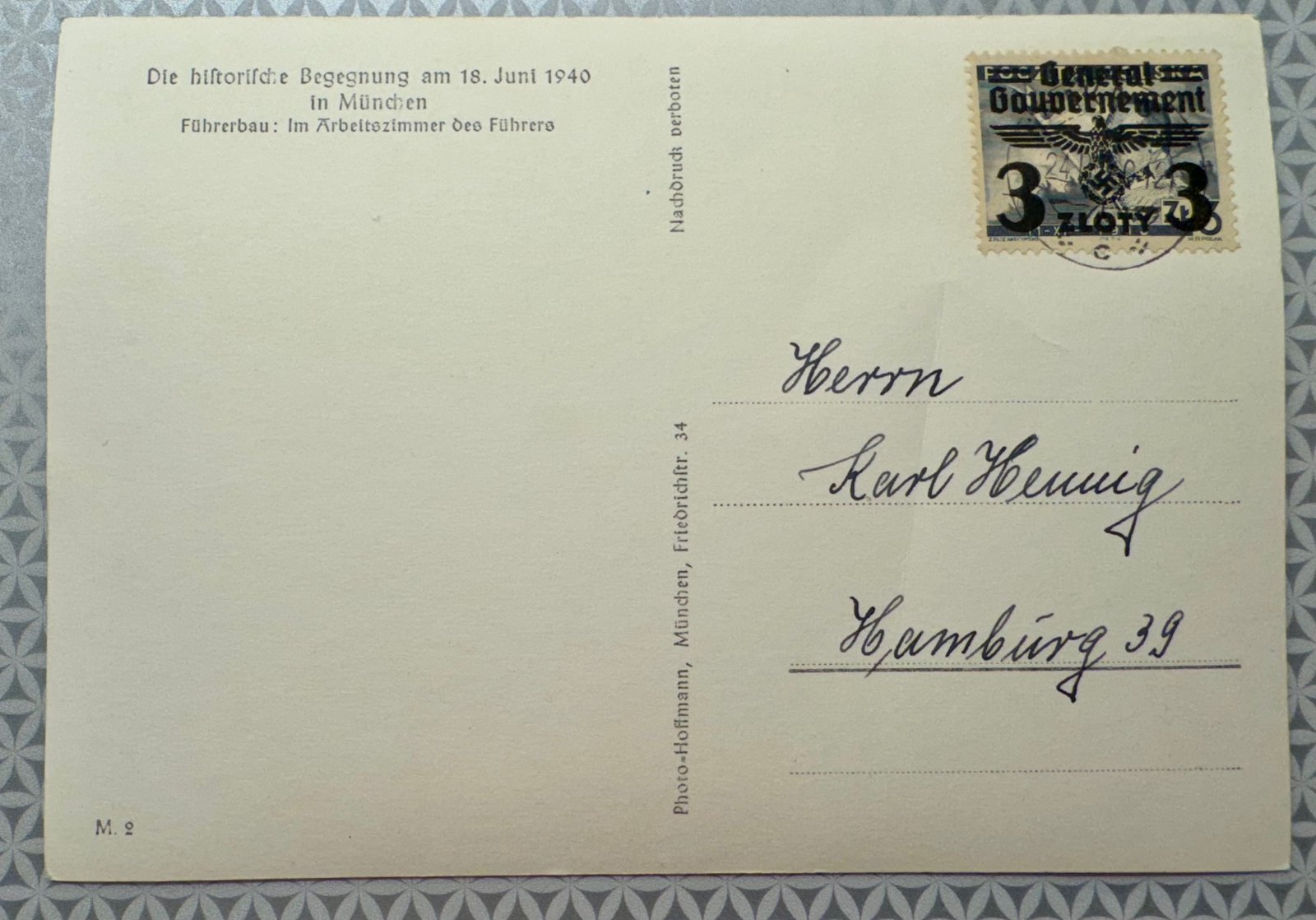 Die historische Begegnung am 18.6.1940 in Munchen - Fuhrerbau, showing Hitler, Mussolini , and von Epp. A Karl Hennig collection postcard