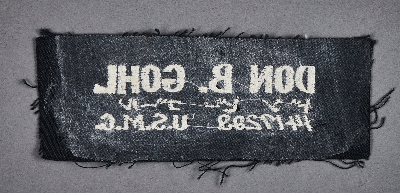 Don B. Gohl 1417299 U.S.M.C., embroidery on cloth, 5 1/2" x 2 1/4"