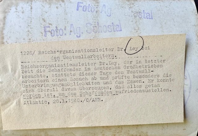 Dr. Robert Ley at the West Wall with Org Todt workers in Essen, period press photo, 7" X 5"