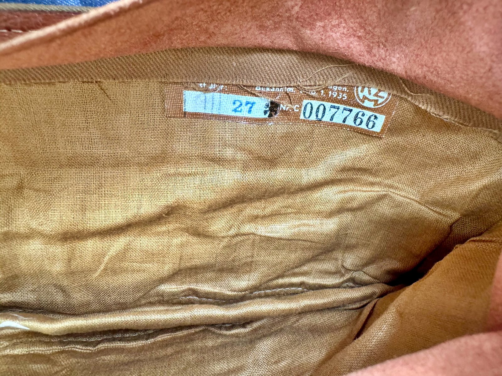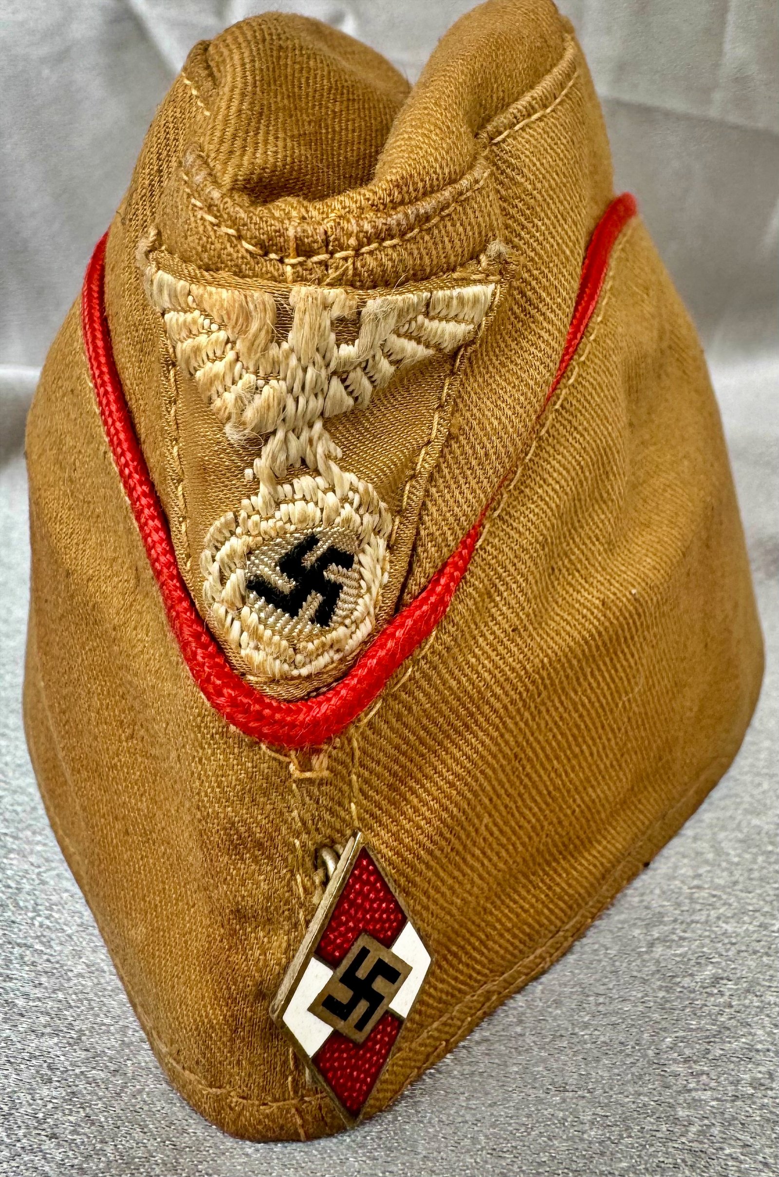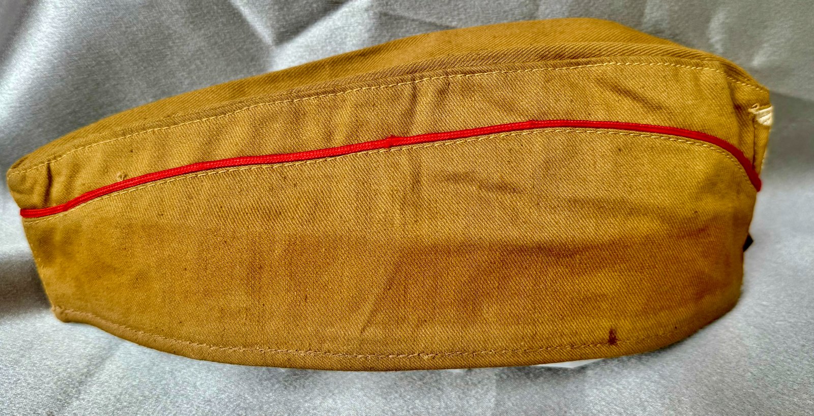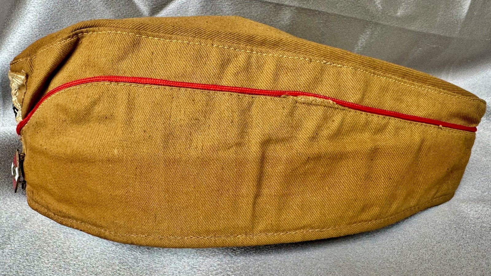 Early HJ Overseas Cap, pin badge RZM marked M1/6, size 53, RZM tag under pliable sweatband