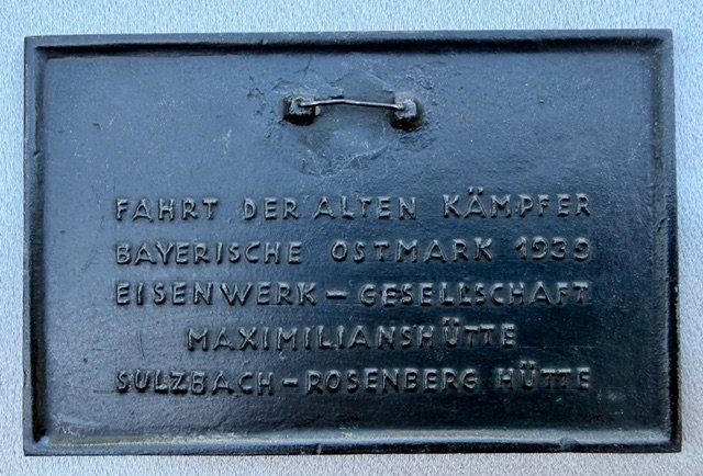 Ein Volk Ein Reich Ein Führer 1938 Plaque, hanger to the reverse with inscription "Fahrt Der Alten Kämpfer Bayerische Ostmark 1939 Eidsnwerk-Gesellschaft Maximilianshütte Sulzbach-Rosenberg Hütte" , cast iron, 144mm x 93mm